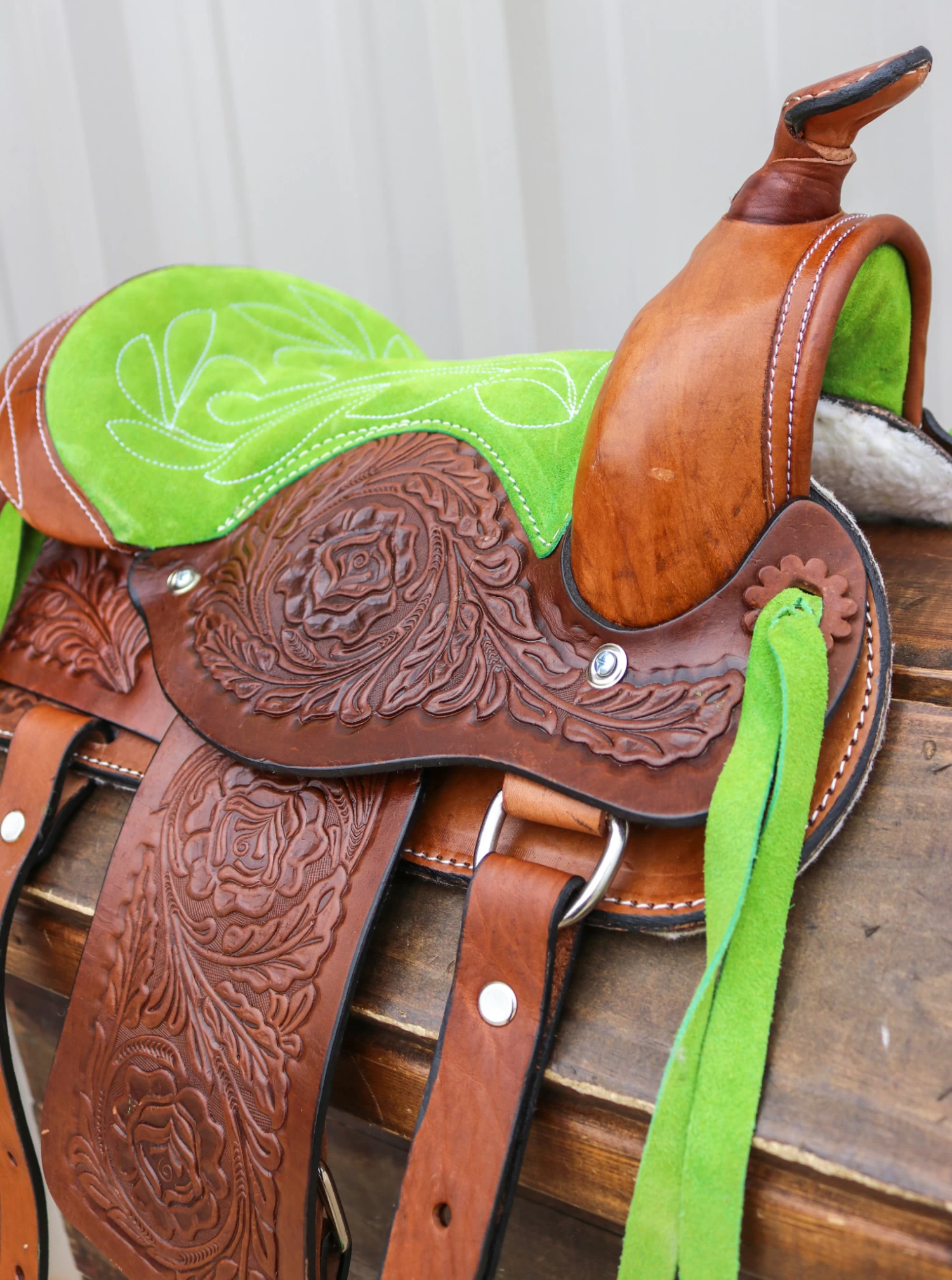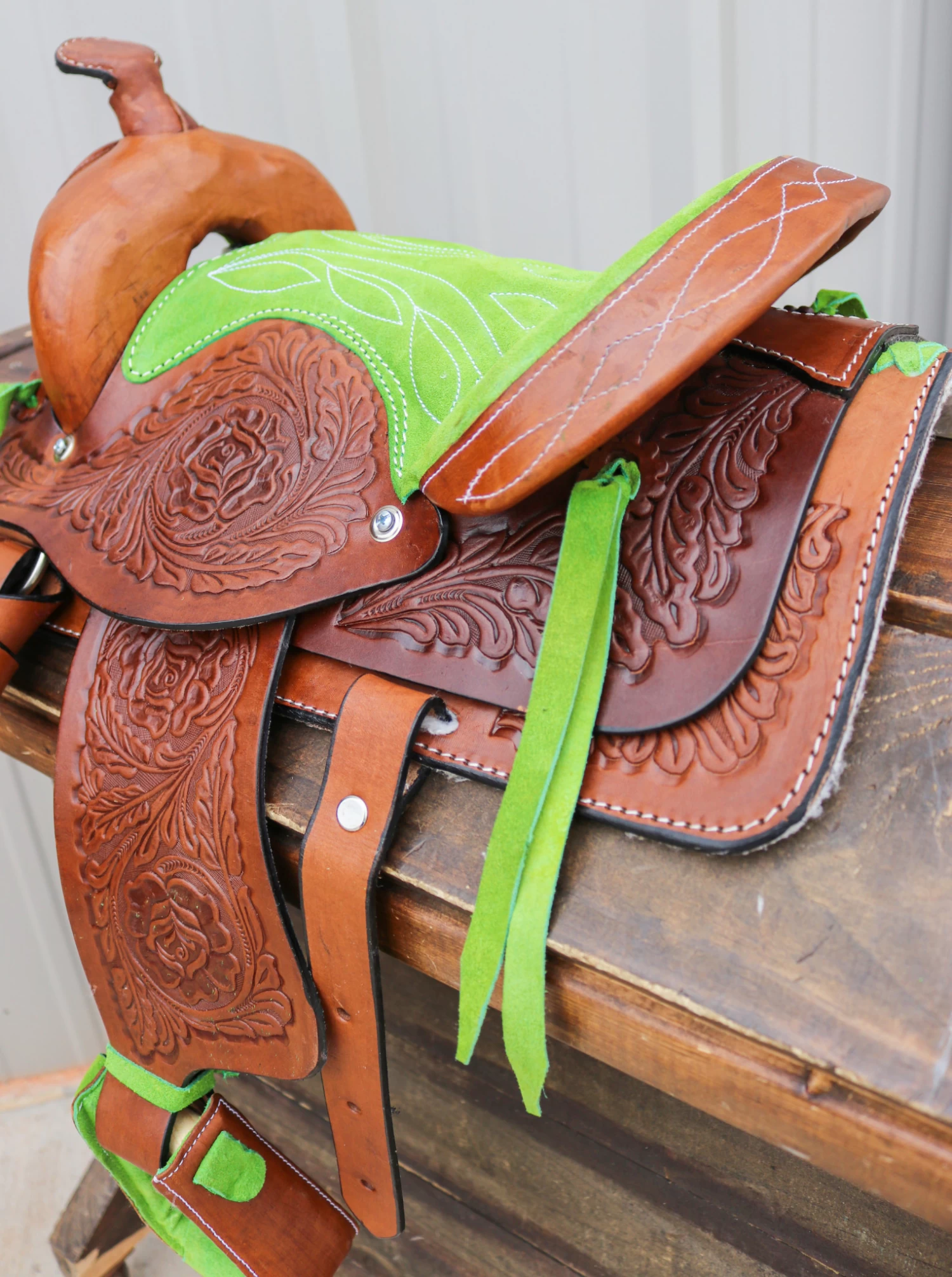 This is a comfortable and affordable Lime green/brown western kid saddle. Built for children with durable leather, hardware, and made to last. Can be used on a miniature horse, shetland pony, and normal sized pony. Great for kids from 5 years old to 10 years old. Can be used for pleasure and trail horse riding. MEASUREMENTS Horn – 2″ Skirt – 17″ x 15″ Wood Tree – 5″ Gullet Stirrups Size – 3 3/4″ Width, 2″ Tread Stirrups Range 20″- 26″ Measurement is from center of seat to the bottom of the stirrups. Weight – 10 lbs (approx.)