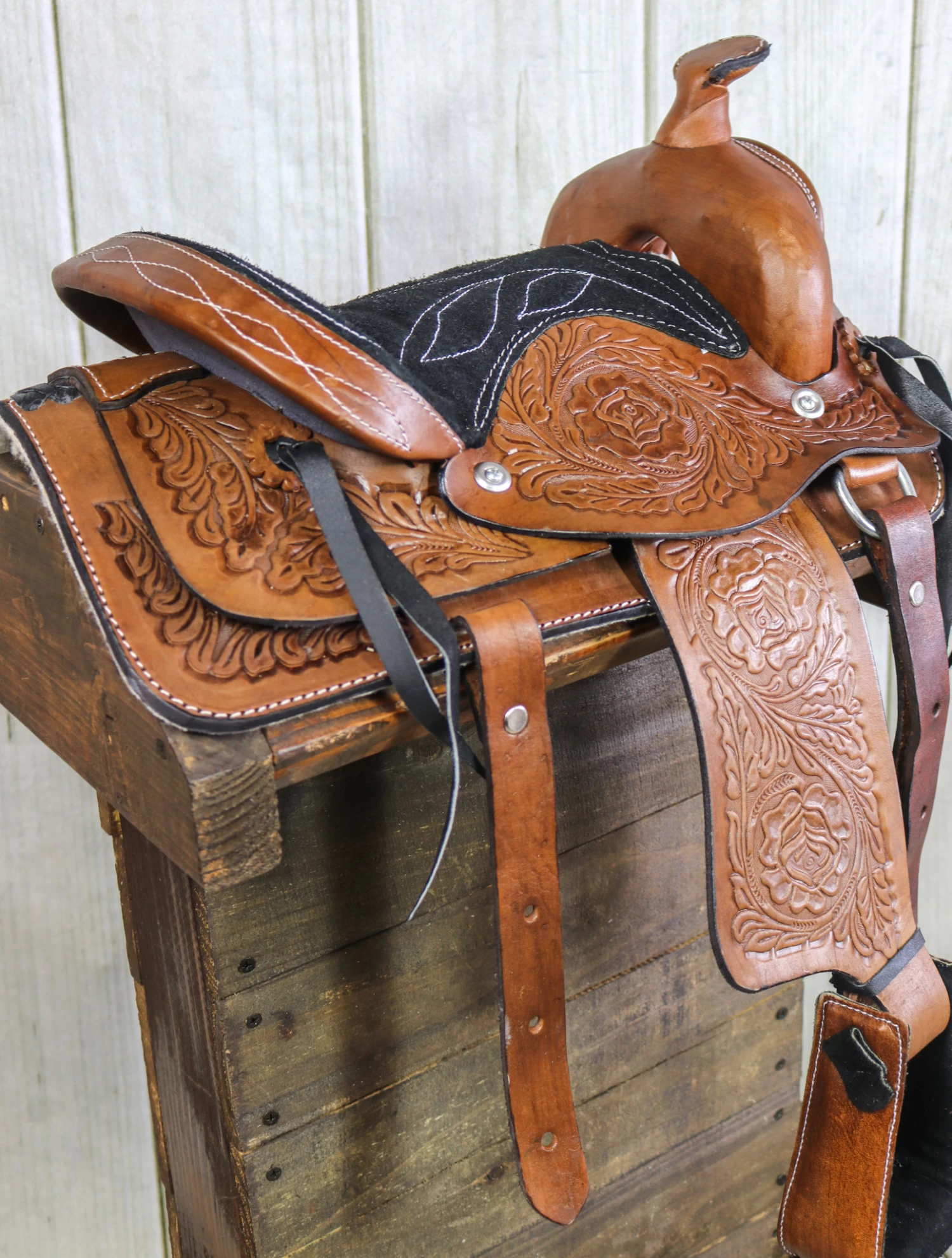 Handmade saddle made with real brown leather and has unique tooling. Suede leather seat that is comfortable for any rider. Perfect for any miniature or pony.