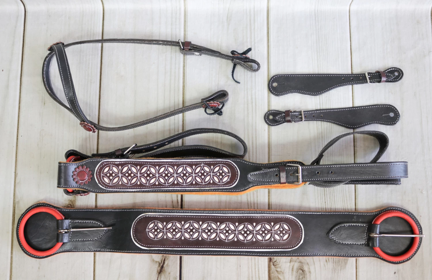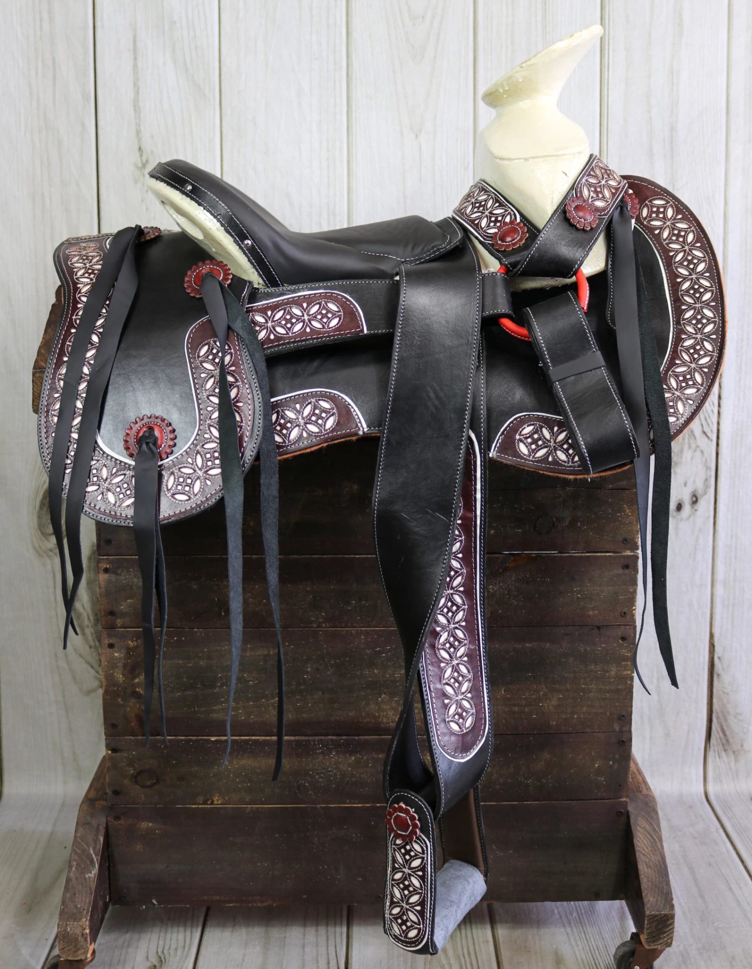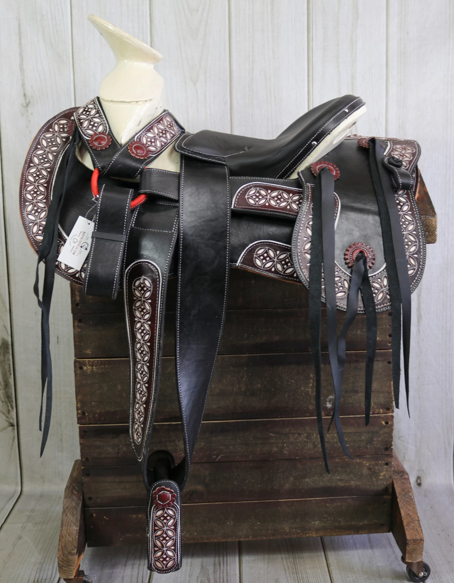This excellent quality handmade black colored charro saddle is made in Mexico. It features unique beautiful custom design all over the saddle and wood saddle tree.