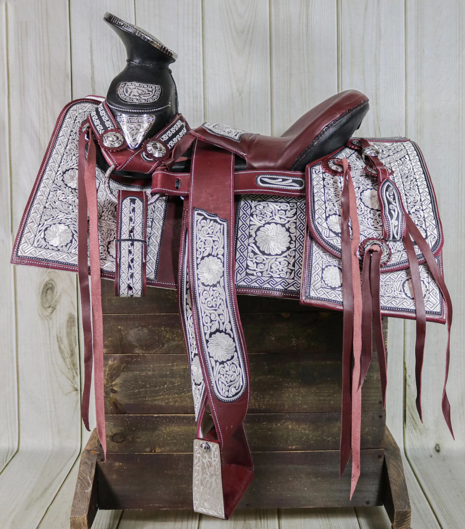 This square skirt charro saddle is imported from Mexico and features embroidered designs and that extends from the saddle to the complete tack package including breast collar, headstall, straps , and cinch. Also includes stainless steel hardware on saddle and headstall and breast collar.