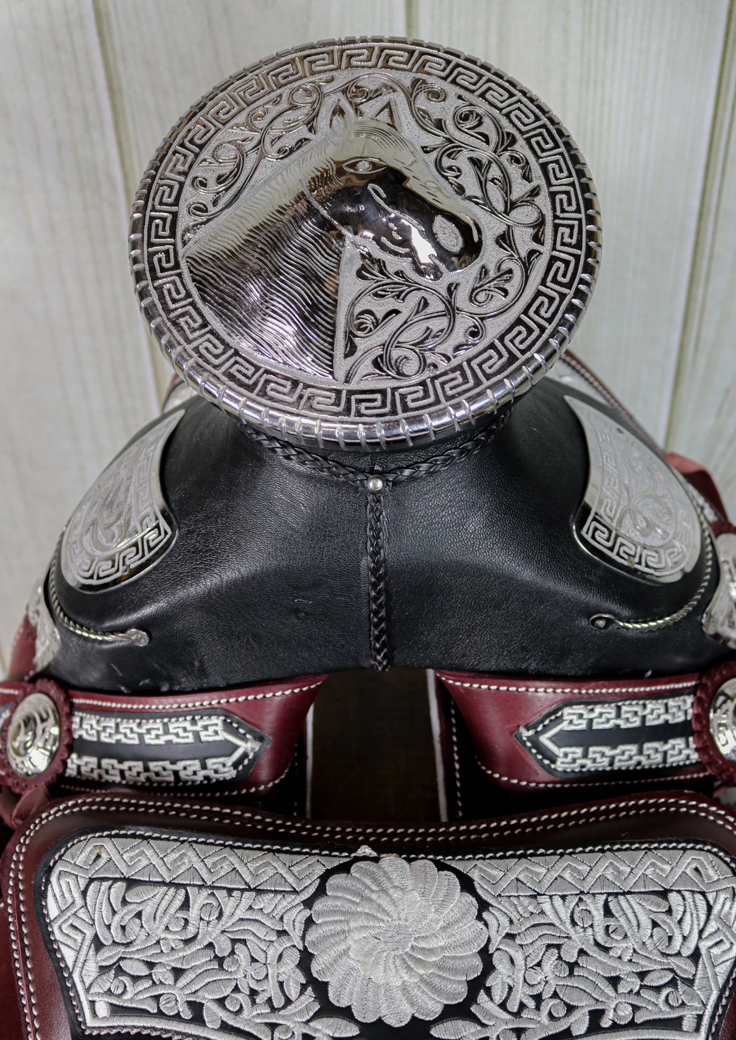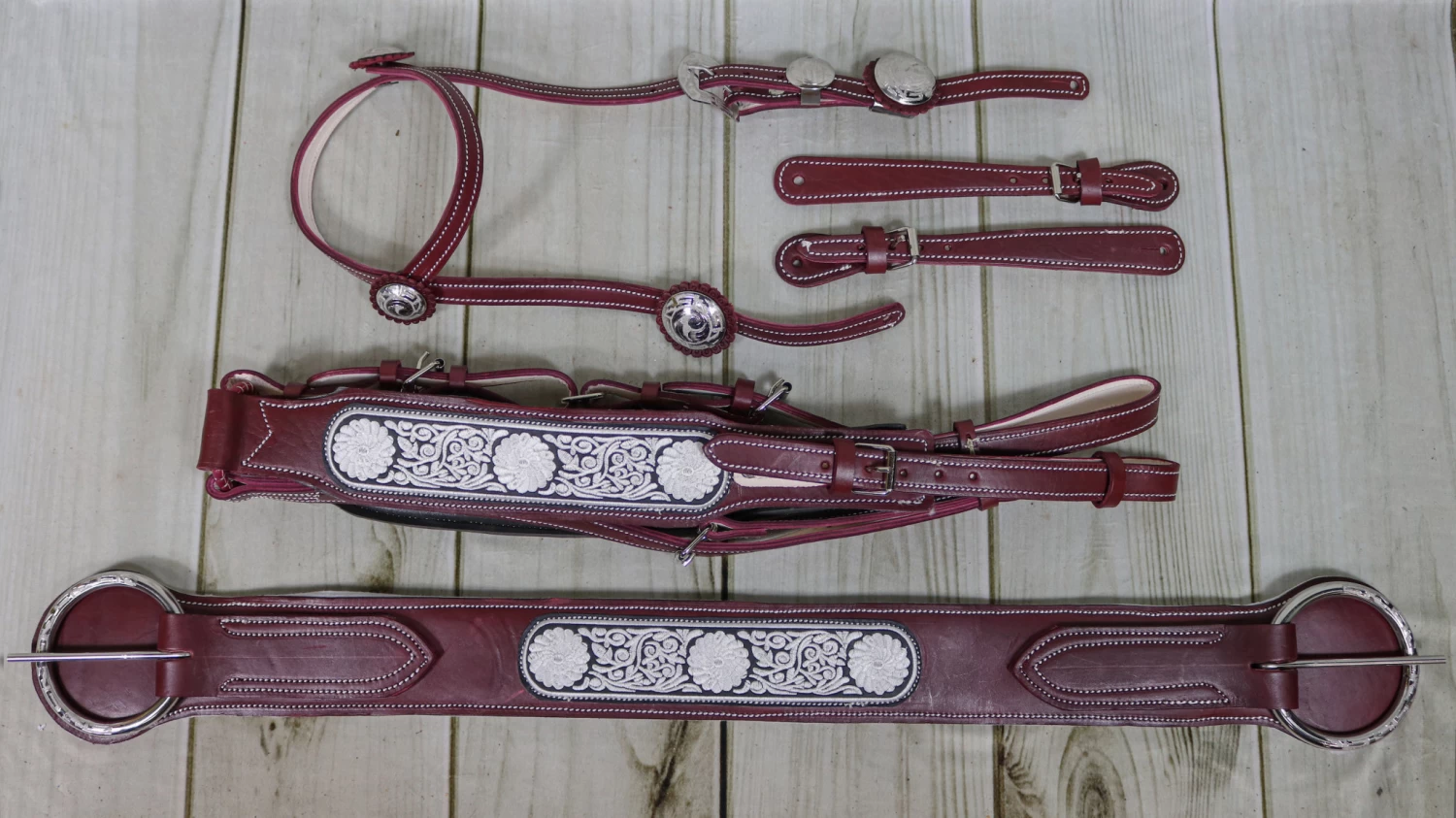Montura charra natural importada de Mexico. Montura bordada y con diseño en cuero que se extiende desde la silla de montar hasta el paquete completo con pecho-pretal, cabezada, cincho y correones para espuelas. ; tambien con el juego de herrajes para la silla y para la cabezada y pecho pretal de acero.