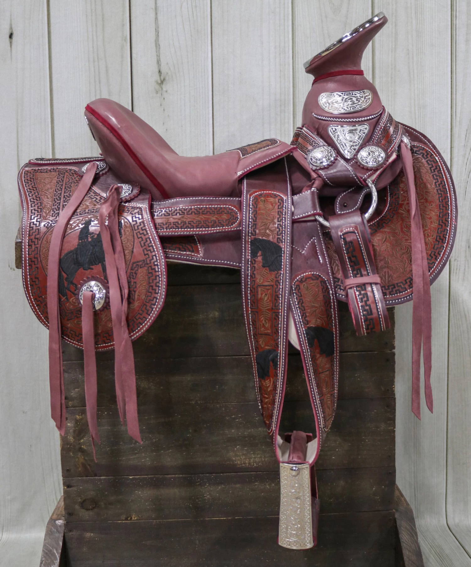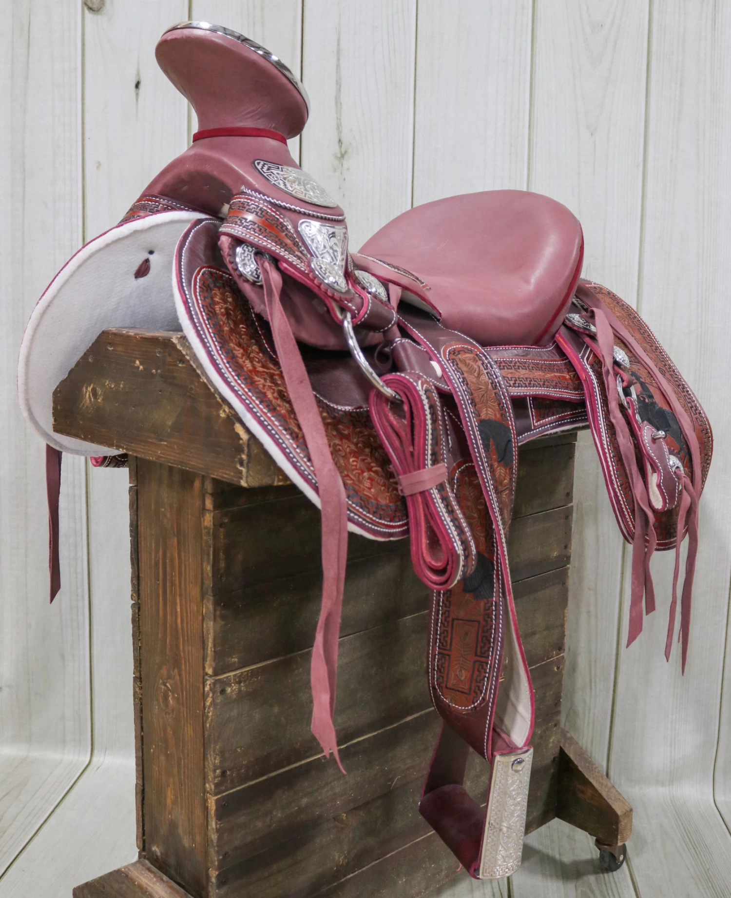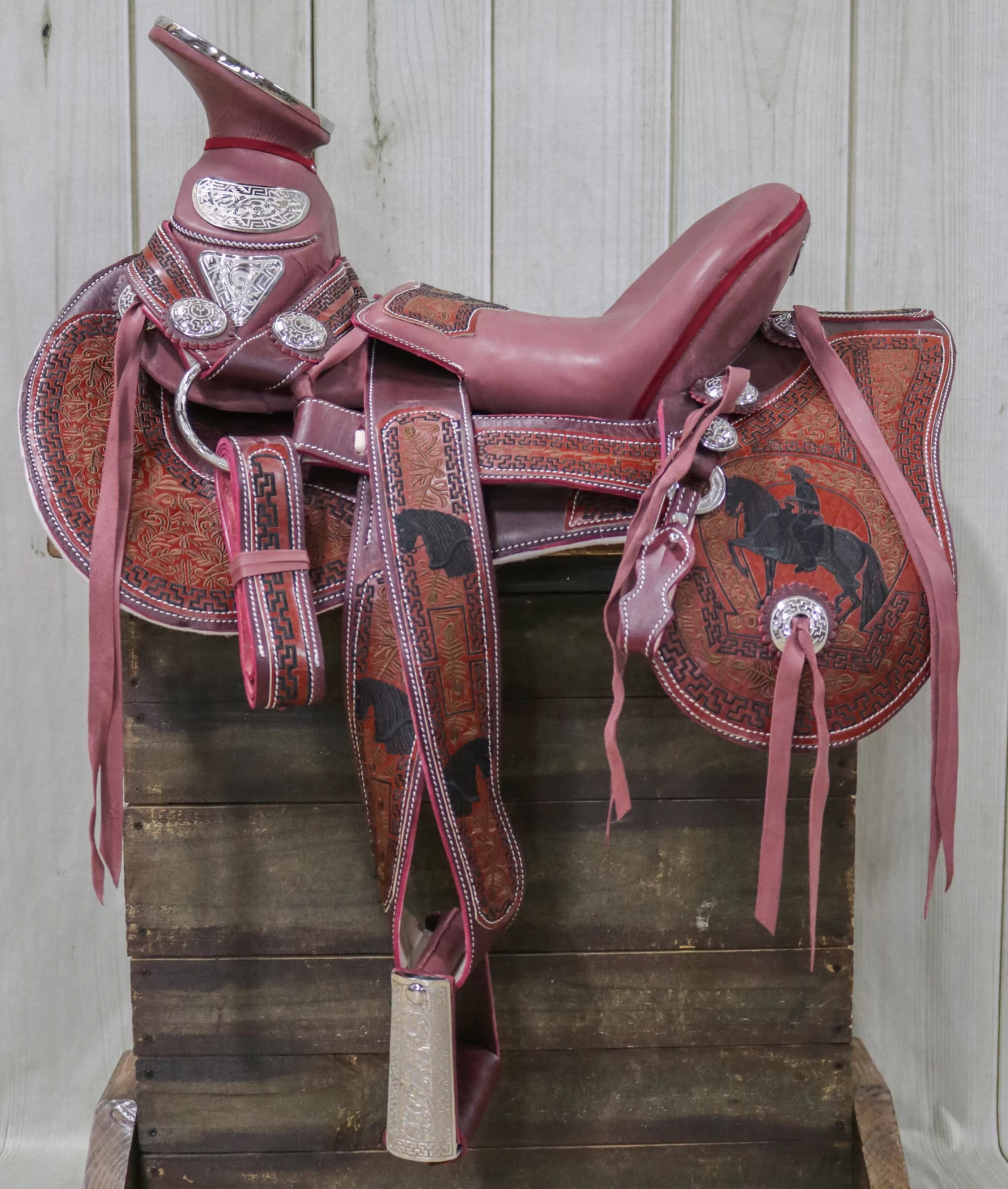 Charro saddle esta montura charra es importada de Mexico. Montura bordada y con un cuero con un diseño que se extiende desde la silla de montar hasta el paquete completo, con pecho-pretal , cabezada, cincho, y correones ; tambien con el juego de herrajes para la silla y para la cabezada y pecho pretal de acero. This square skirt charro saddle is imported from Mexcio and features embroidered designs and that extends from the saddle to the complete tack package including breast collar, headstall, straps , and cinch. Also includes stainless steel hardware on saddle and headstall and breast collar.