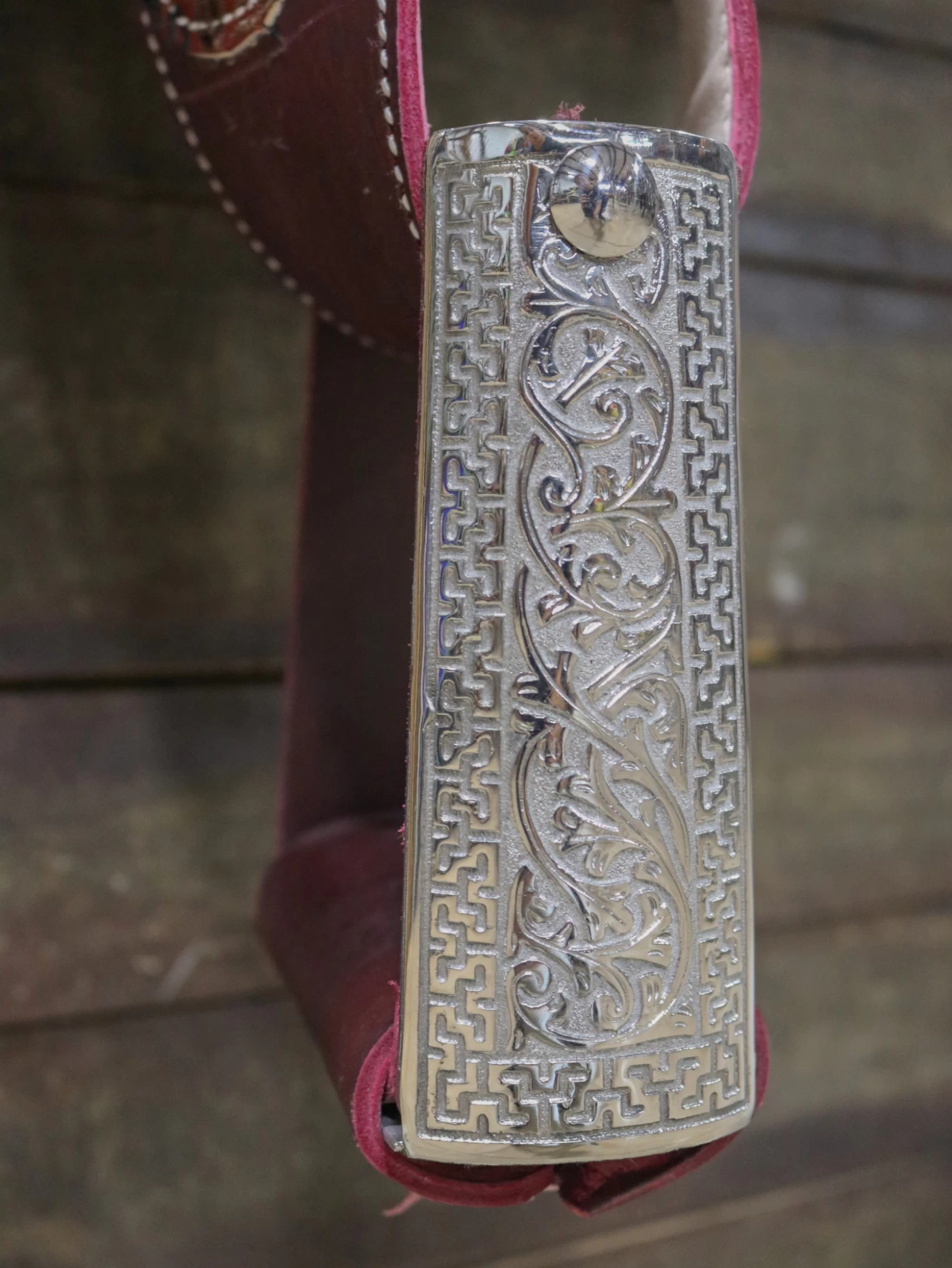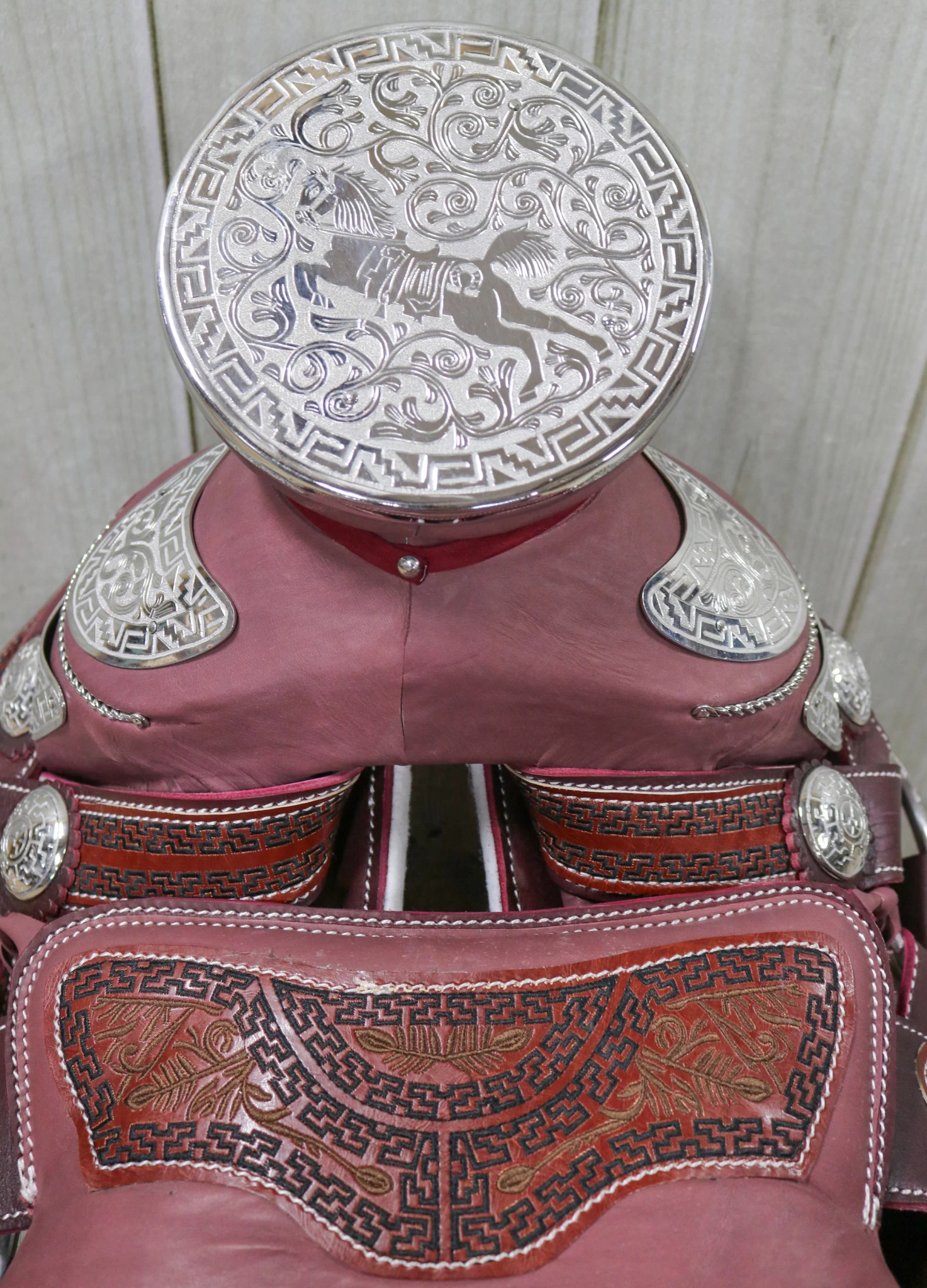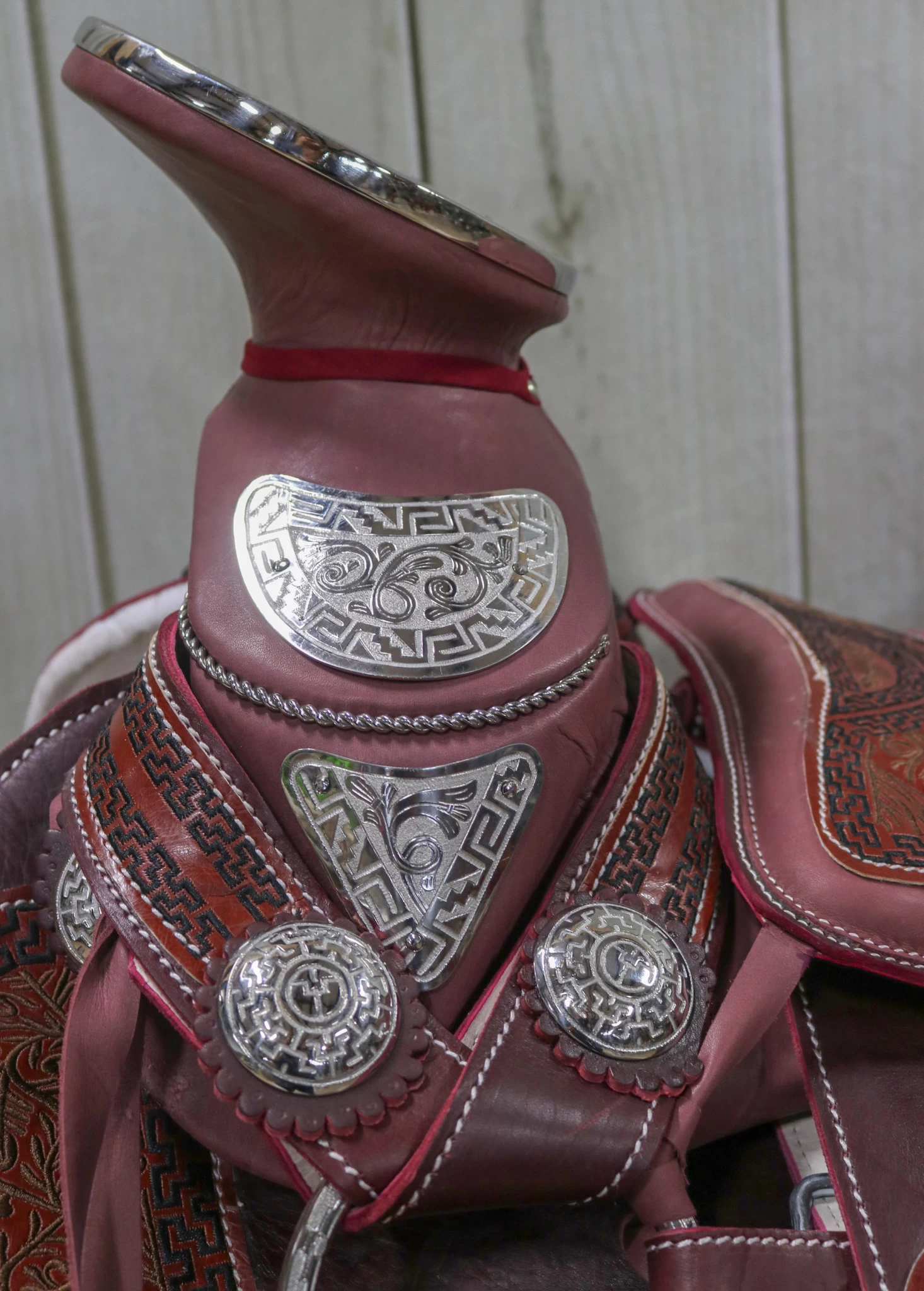 Charro saddle esta montura charra es importada de Mexico. Montura bordada y con un cuero con un diseño que se extiende desde la silla de montar hasta el paquete completo, con pecho-pretal , cabezada, cincho, y correones ; tambien con el juego de herrajes para la silla y para la cabezada y pecho pretal de acero. This square skirt charro saddle is imported from Mexcio and features embroidered designs and that extends from the saddle to the complete tack package including breast collar, headstall, straps , and cinch. Also includes stainless steel hardware on saddle and headstall and breast collar.