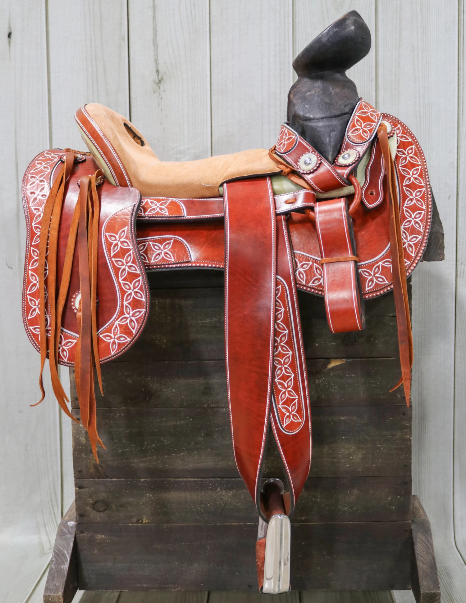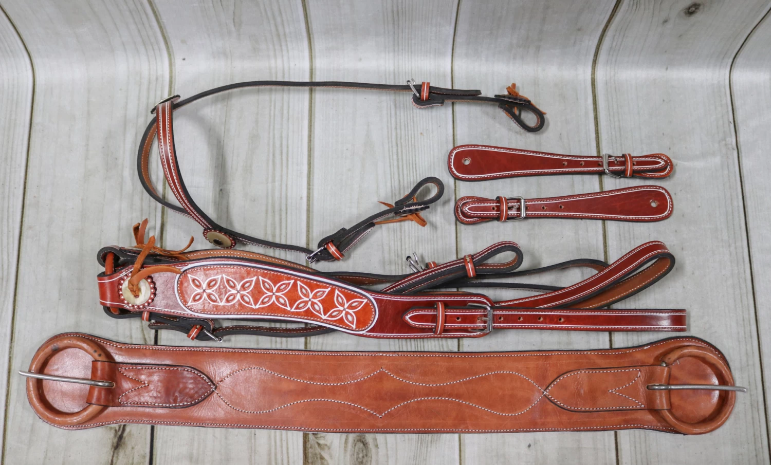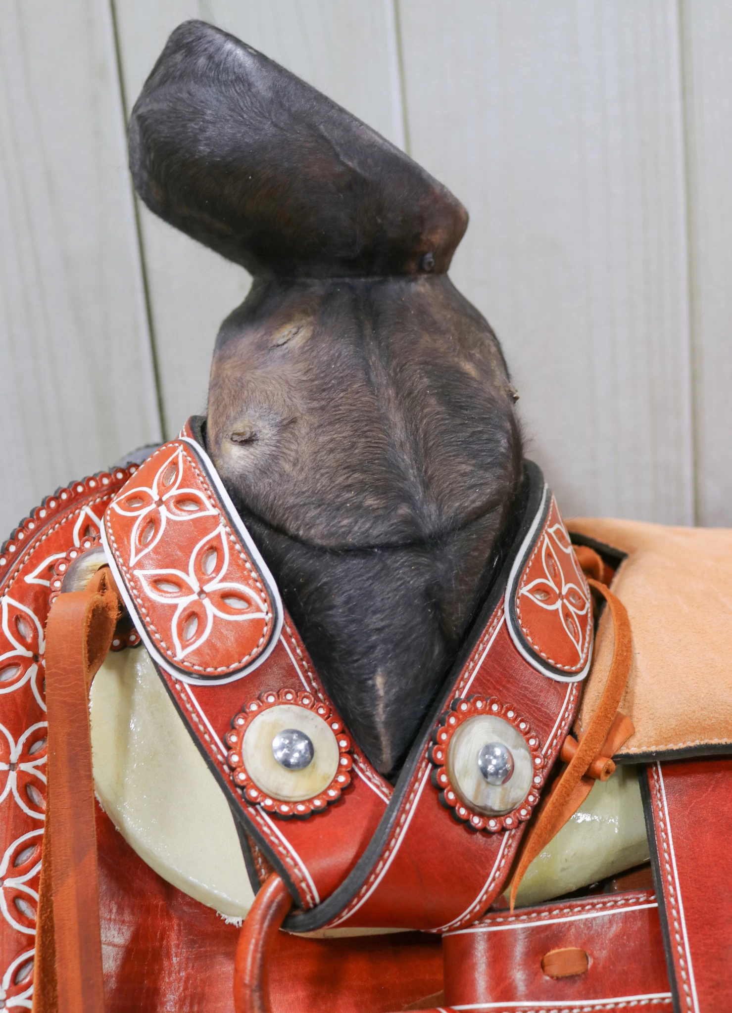 Charro saddle esta montura charra es importada de Mexico. Montura Fina y con un cuero con un diseño que se extiende desde la silla de montar hasta el paquete completo, con pecho-pretal , cabezada, y correones ; tambien con el juego de herrajes de Cuerno De Venado para la silla y para la cabezada y pecho pretal con Cuerno De Venado. This rounded skirt charro saddle is imported from Mexcio and features traditional design and that extends from the saddle to the complete tack package including breast collar, headstall, and straps.Â