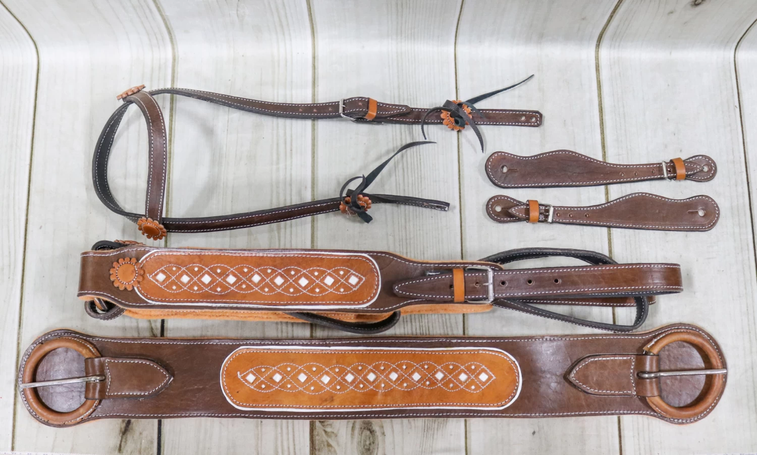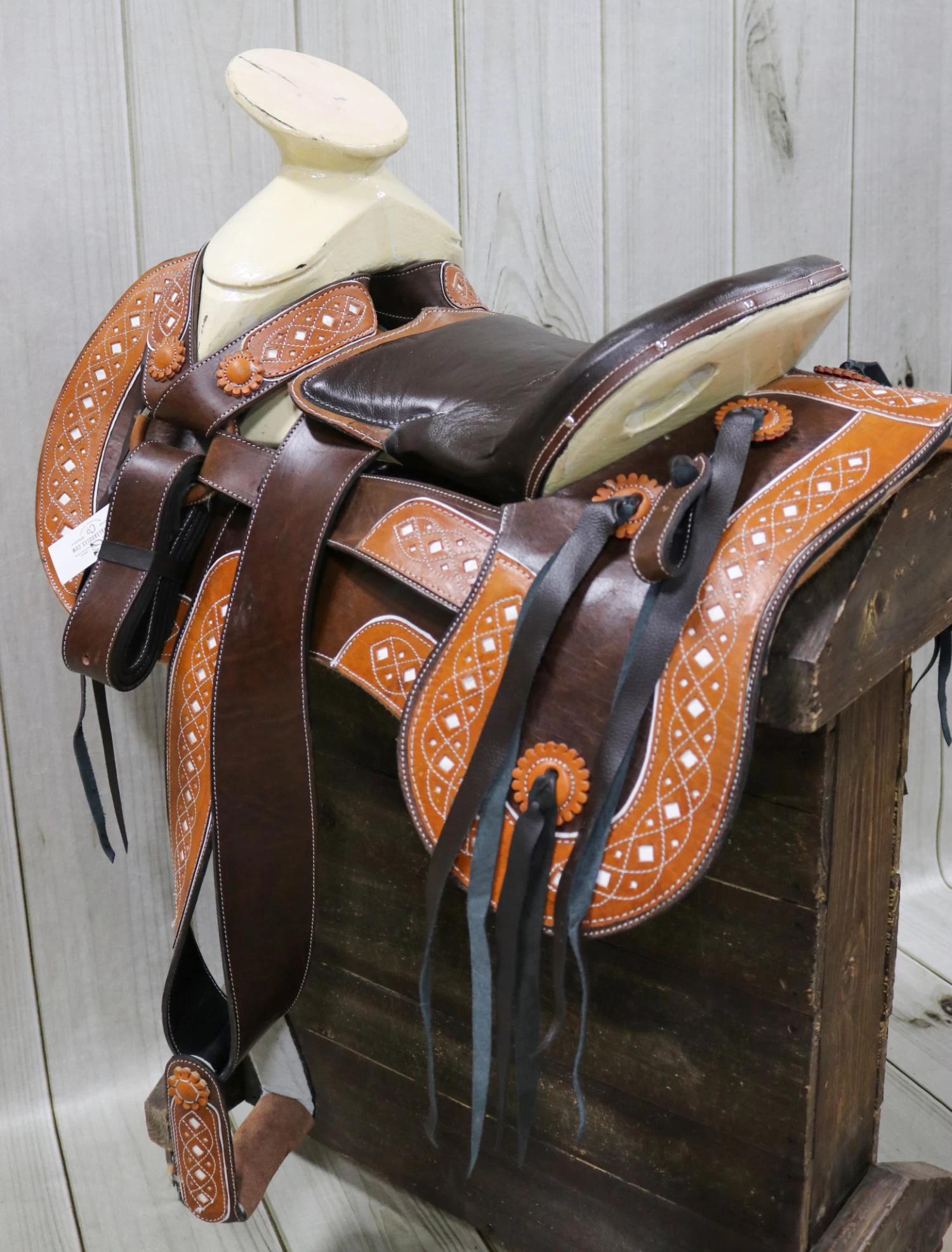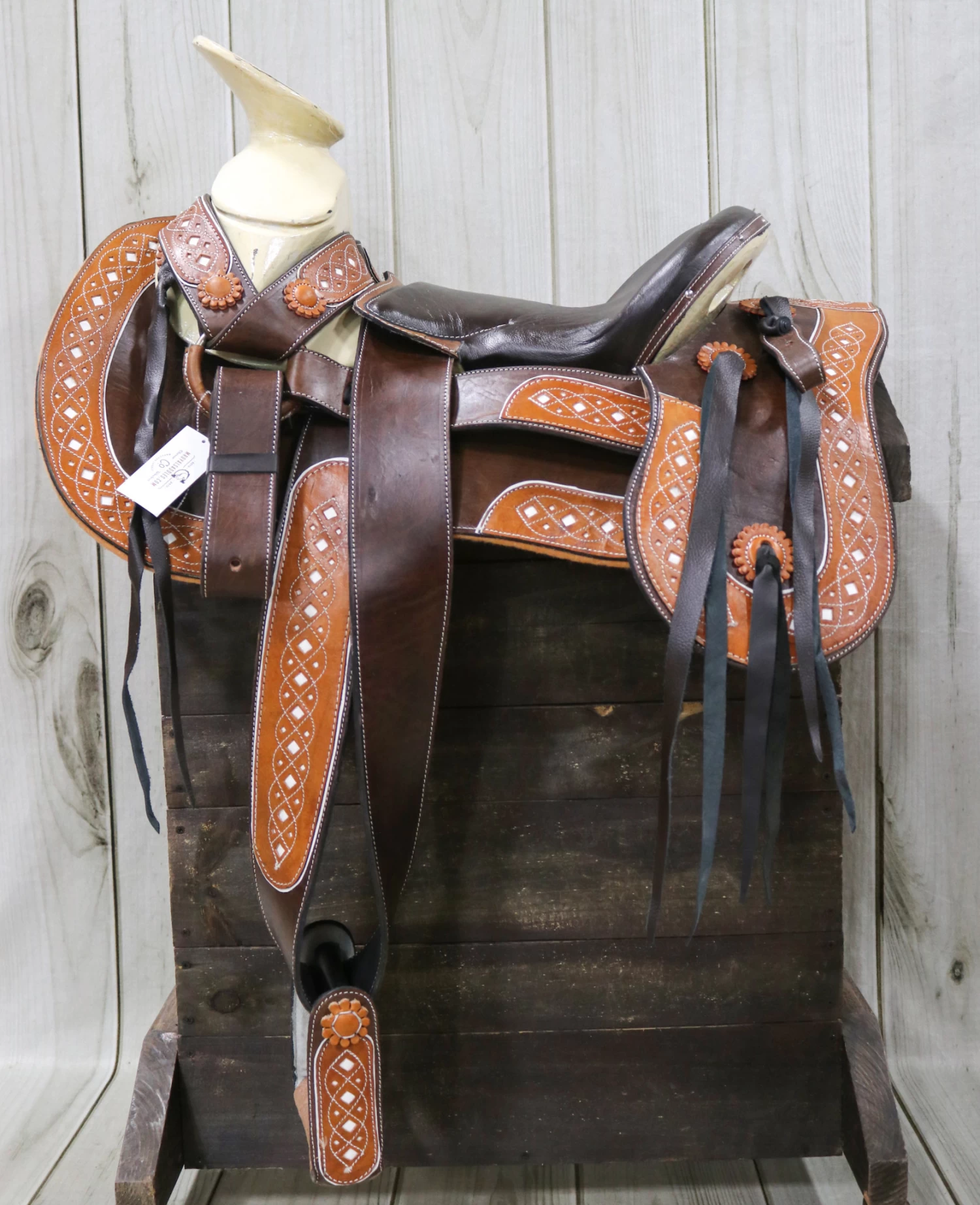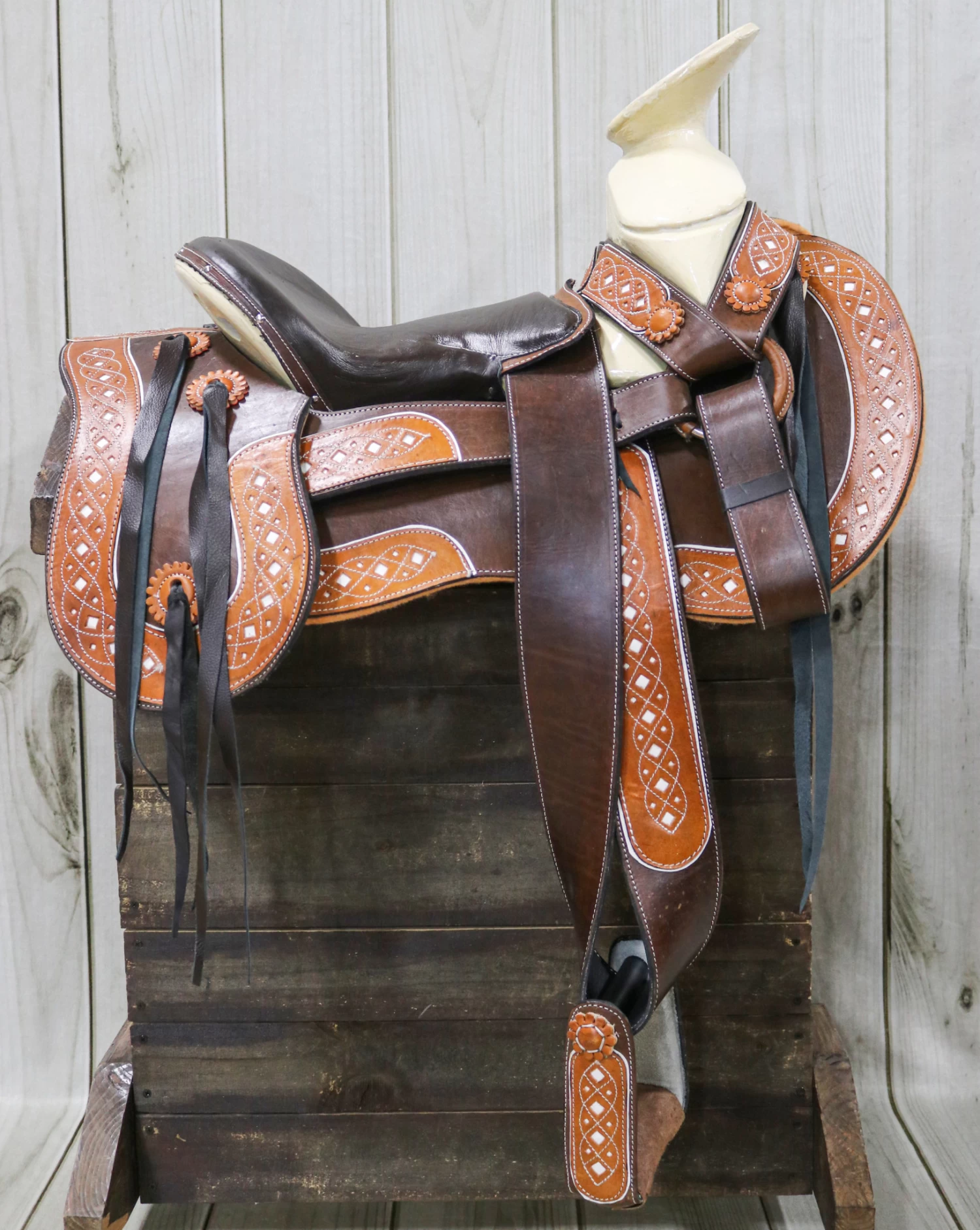 This excellent quality handmade brown colored charro saddle is made in Mexico. It features unique beautiful custom design all over the saddle and wood saddle tree.