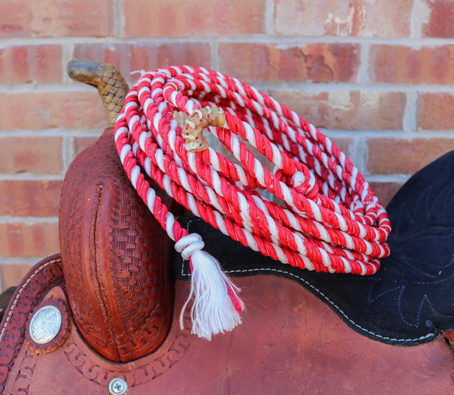 Medium lay adult rope is made from 100% waxed nylon with rawhide burner. Measures 7/16 ” x 30″. Rope color is red/white. Measurements- 30ft x 7/16″