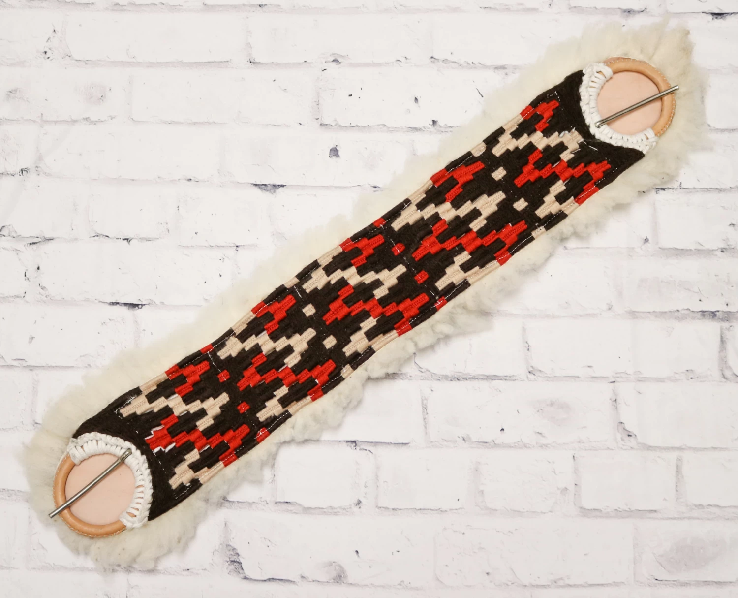 Traditional felt lined charro cinch featuring leather covered buckles and steel tongues, custom design. Hand braided cotton charro cinch with traditional pattern lined with a heavy felt under the cinch rings, size 35.5″.Made in Mexico. Cincho tradicional con hebillas de acero cubiertas de cuero. Cincho de algodon trenzado hecho a mano, talla 35.5″.