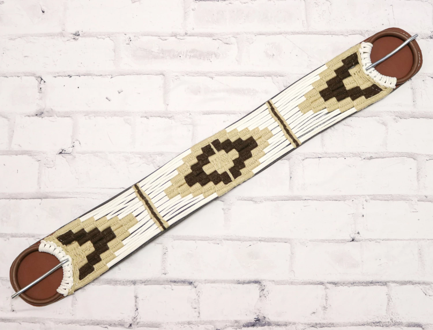 Traditional felt lined charro cinch featuring leather covered buckles and steel tongues, custom design. Hand braided cotton charro cinch with traditional pattern lined under the cinch rings, size 35″.Made in Mexico. Cincho tradicional con hebillas de acero cubiertas de cuero. Cincho de algodon trenzado hecho a mano, talla 35″.