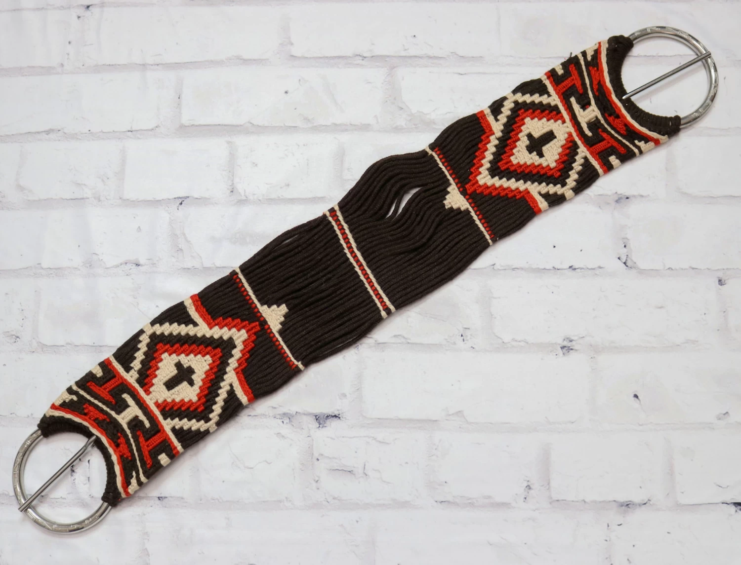 Traditional charro cinch featuring stainless steel buckles, custom design. Hand braided cotton charro cinch with traditional, size 35″. Made in Mexico. Cincho tradicional con hebillas de acero. Cincho de algodon trenzado hecho a mano, talla 35″.