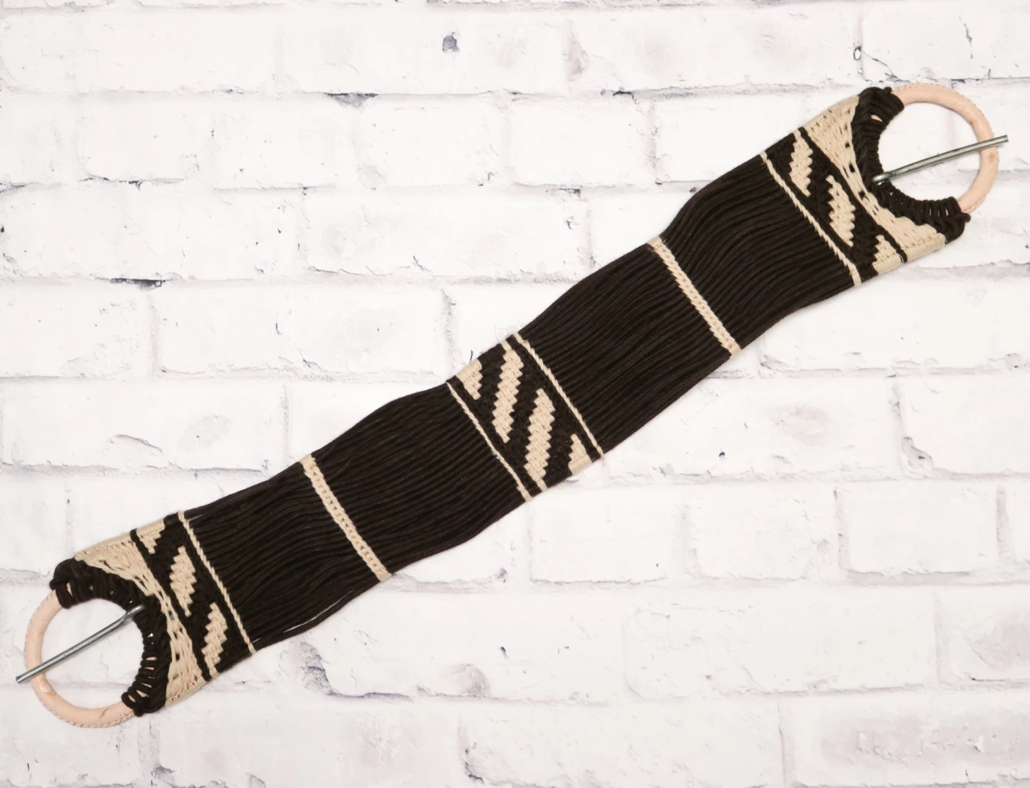 Simple brown cotton charro cinch that is offered with traditional pattern, custom design. Cincho cafe simple con diseño tradicional. Hecho a mano. Made in Mexico. Length: 35″ Width: 4 3/4″