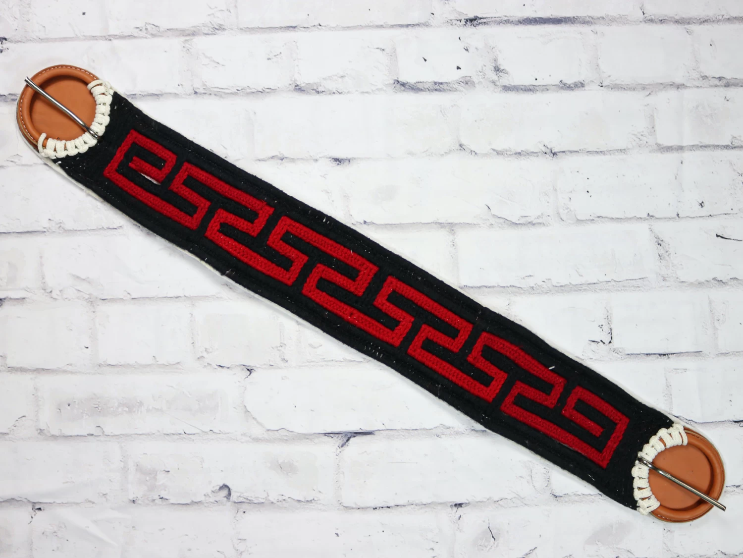 Traditional felt lined charro cinch featuring leather covered buckles and steel tongues, custom design. Hand braided cotton charro cinch with traditional pattern lined with a heavy felt under the cinch rings.Made in Mexico. Cincho tradicional con hebillas de acero cubiertas de cuero. Cincho de algodon trenzado hecho a mano.