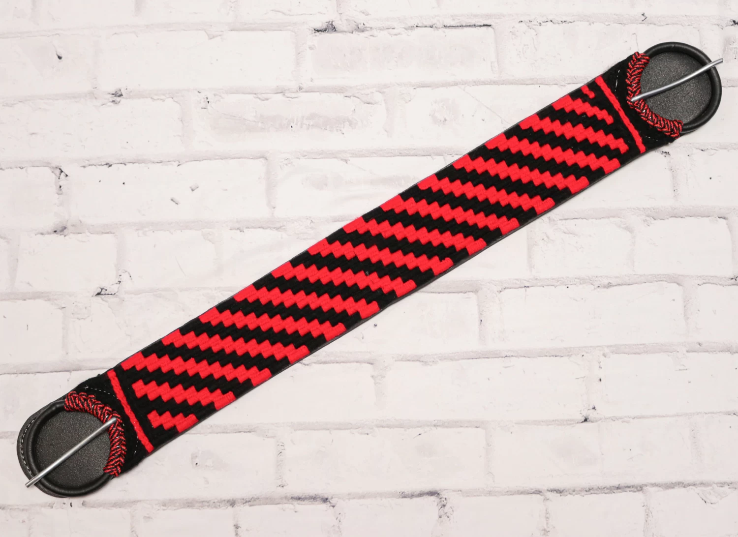 Traditional felt lined charro cinch featuring leather covered buckles and steel tongues, custom design. Hand braided cotton charro cinch with traditional pattern lined with a heavy felt under the cinch rings, size 36″.Made in Mexico. Cincho tradicional con hebillas de acero cubiertas de cuero. Cincho de algodon trenzado hecho a mano, talla 36″.