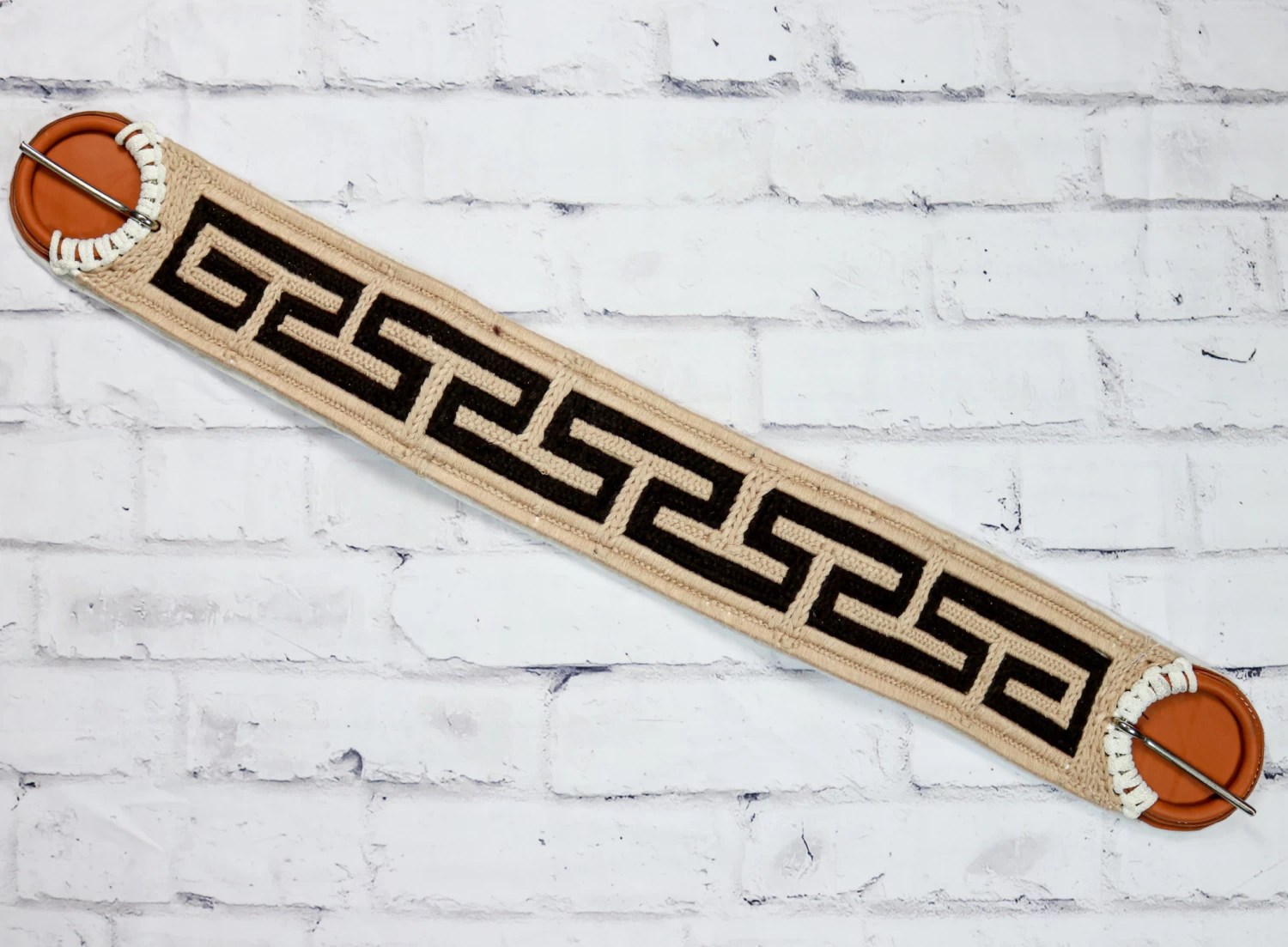 Traditional felt lined charro cinch featuring leather covered buckles and steel tongues, custom design. Hand braided cotton charro cinch with traditional pattern lined with a heavy felt under the cinch rings, size 36″.Made in Mexico. Cincho tradicional con hebillas de acero cubiertas de cuero. Cincho de algodon trenzado hecho a mano, talla 36″.