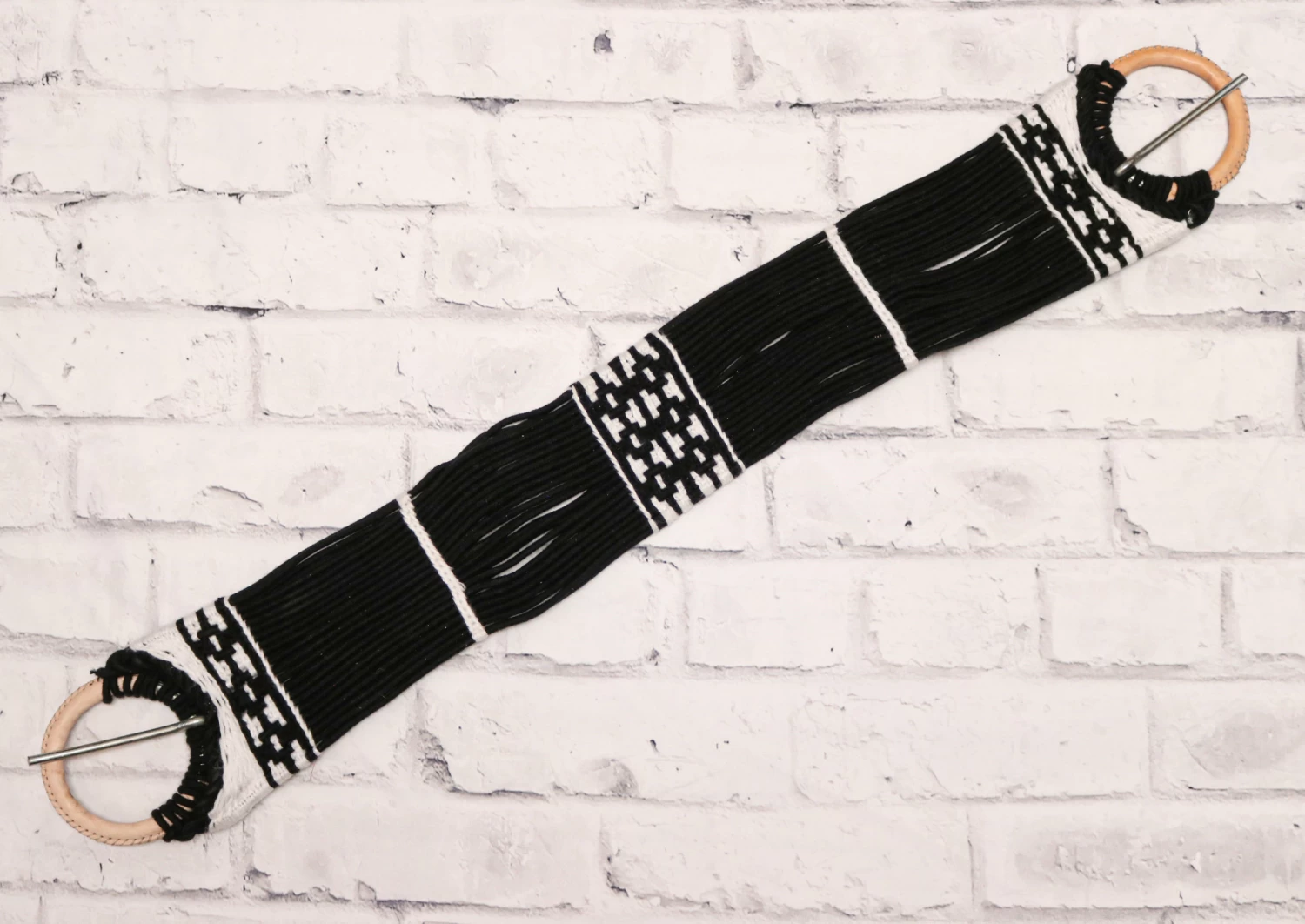 Simple cotton charro cinch that is offered with traditional pattern, custom design. Cincho simple con diseño tradicional. Hecho a mano. Made in Mexico. Length: 37″ Width: 4 3/4″