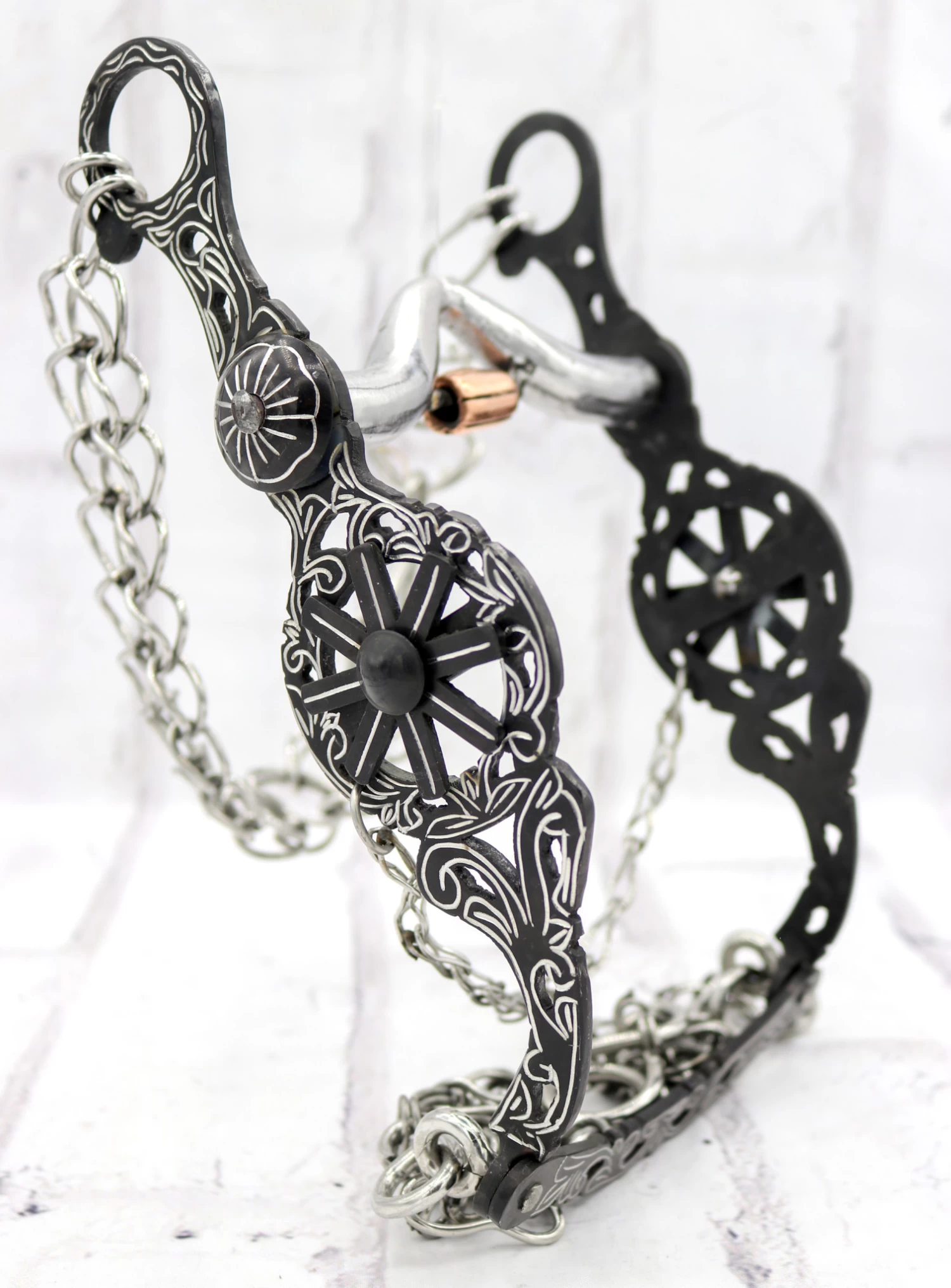 This authentic custom design stainless steel charro horse bit with copper mouth. Includes a complete set of cadenilla chains.