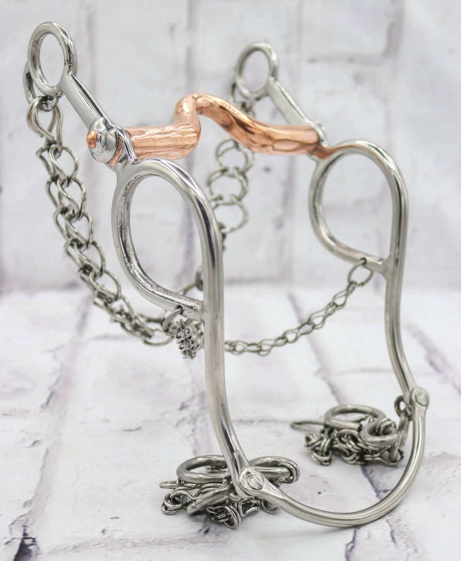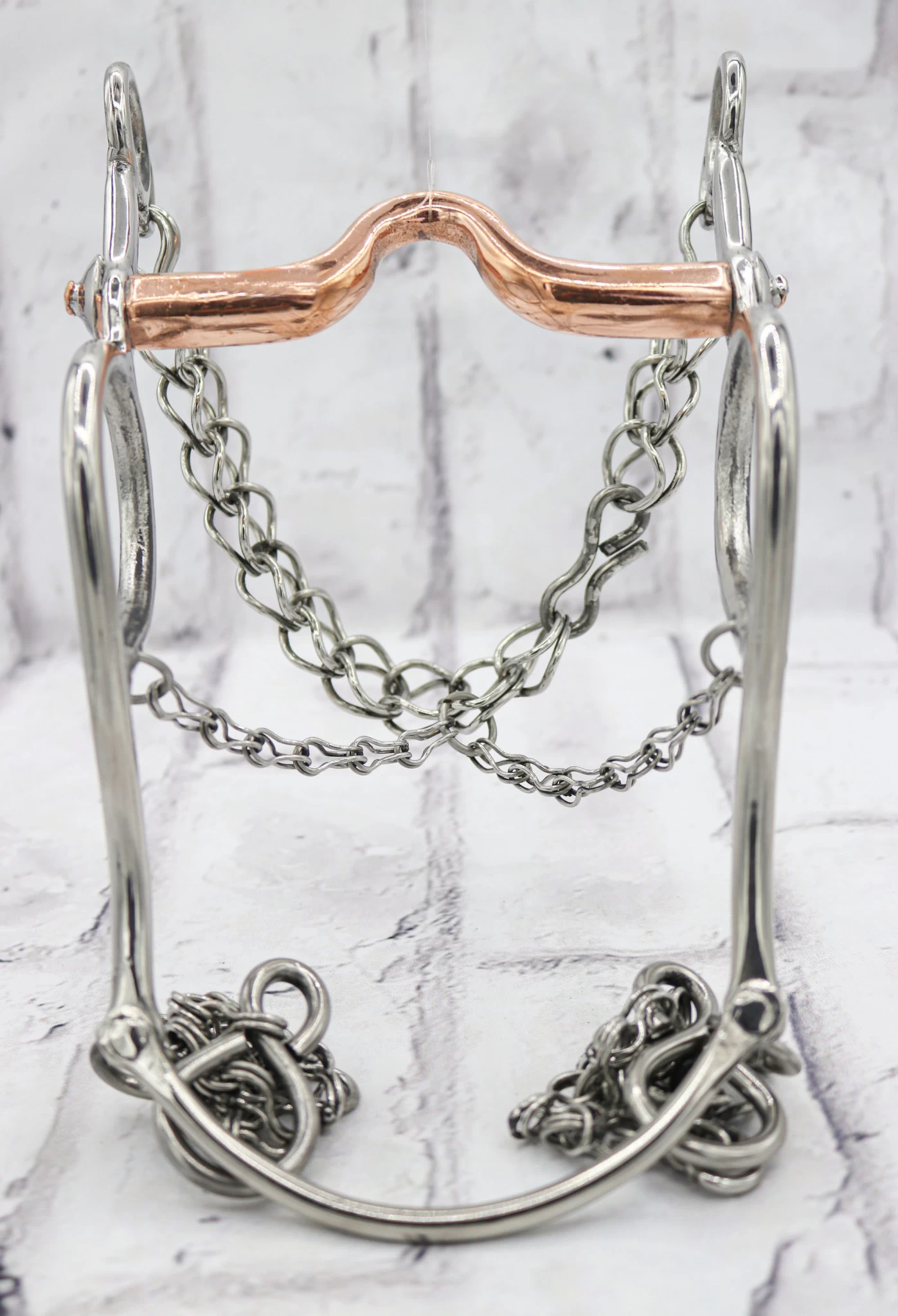 This authentic custom design stainless steel charro horse bit with copper mouth. Includes a complete set of cadenilla chains. Este es un autentico freno charro de acero inoxidable con cobre. Incluye un conjunto completo de las cadenas de cadenilla. Details: Width (ancho): 4 7/8″ Length (largo): 9″