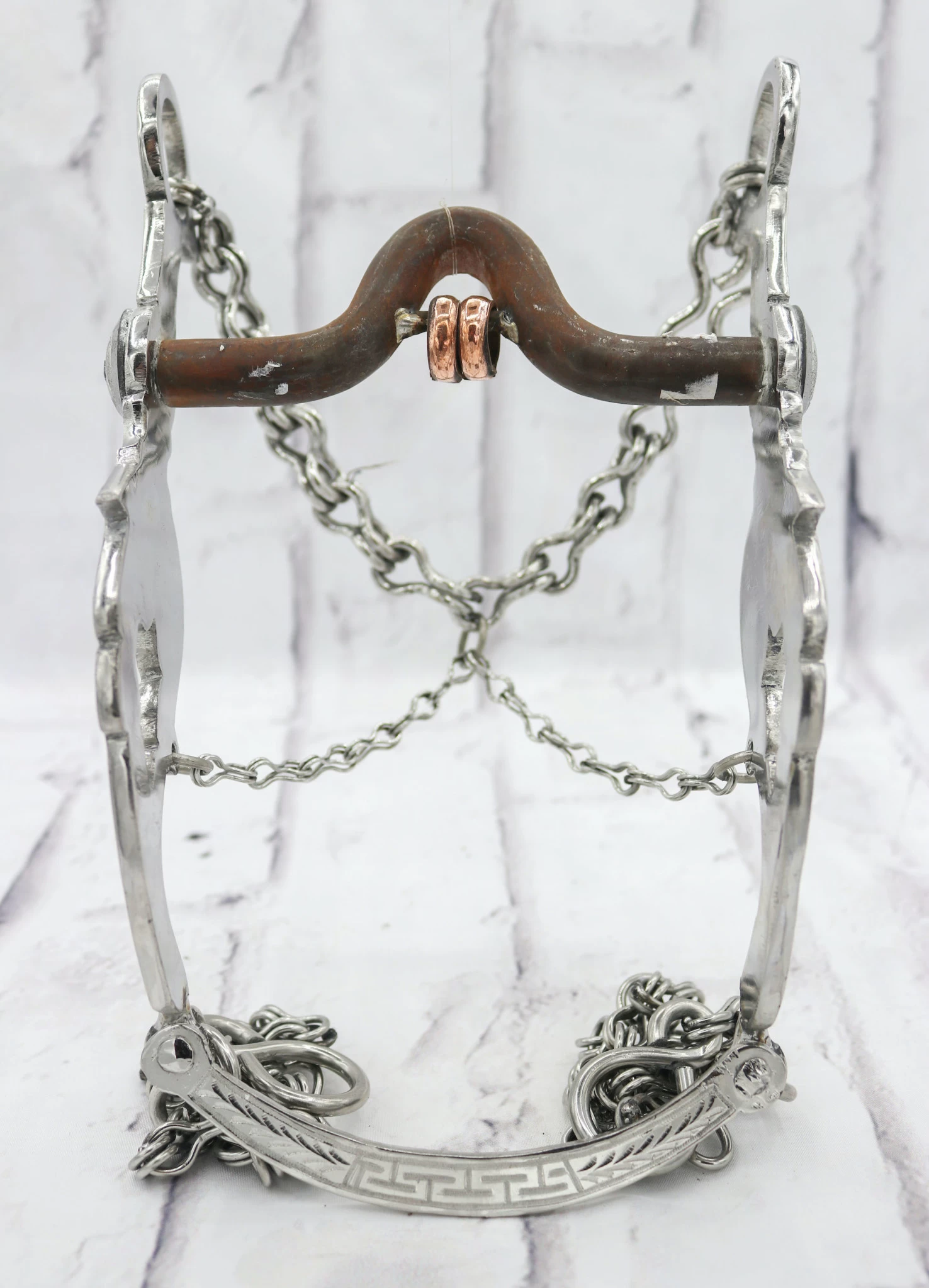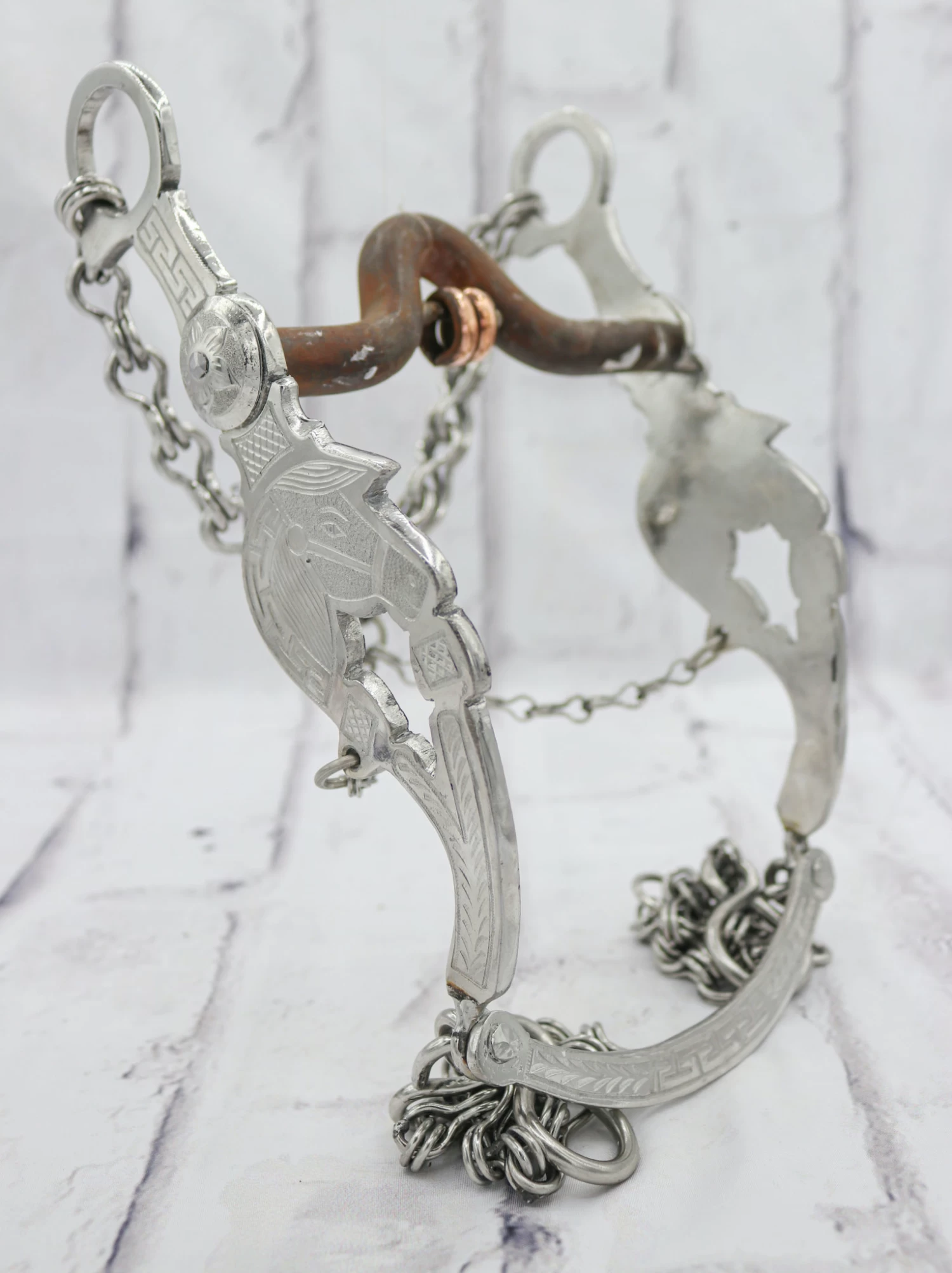This authentic custom design stainless steel charro horse bit with copper mouth. Includes a complete set of cadenilla chains.