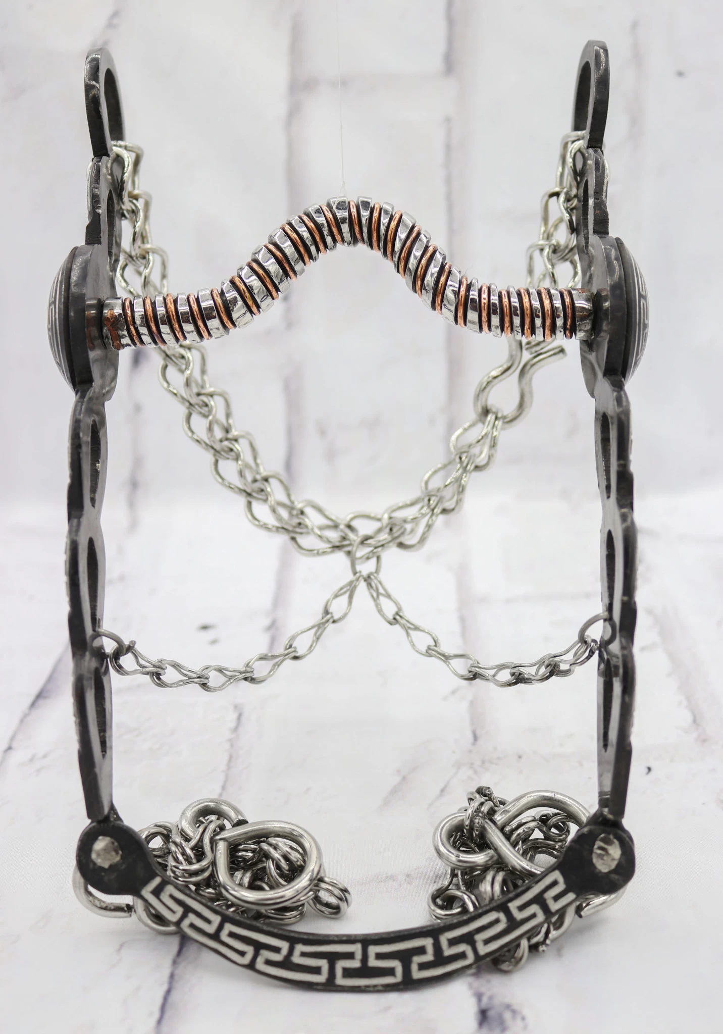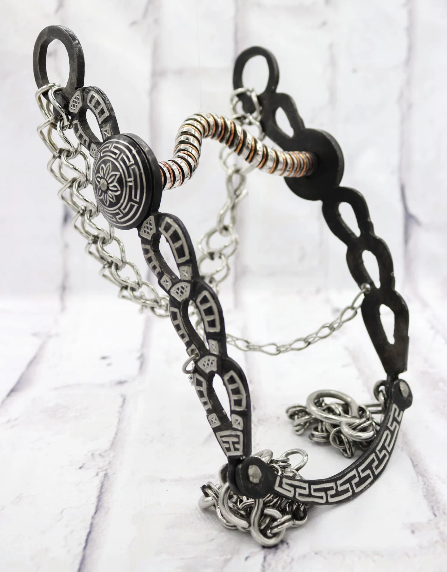 Black low/medium port stainless steel mouthpiece with full copper mouth , burnished black finish and simple engraving featuring 5 1/4″ mouth. With a complete set of cadenillas chains. Freno de porte bajo para caballo bocado de sabor de cobre, acabado color pavonado con acero inoxidable y de grabado sencillo. Width(bocado) – 5 1/4″