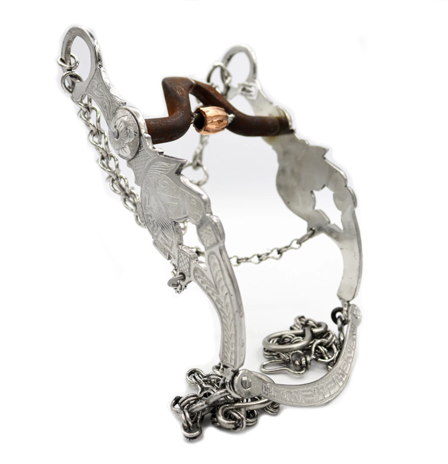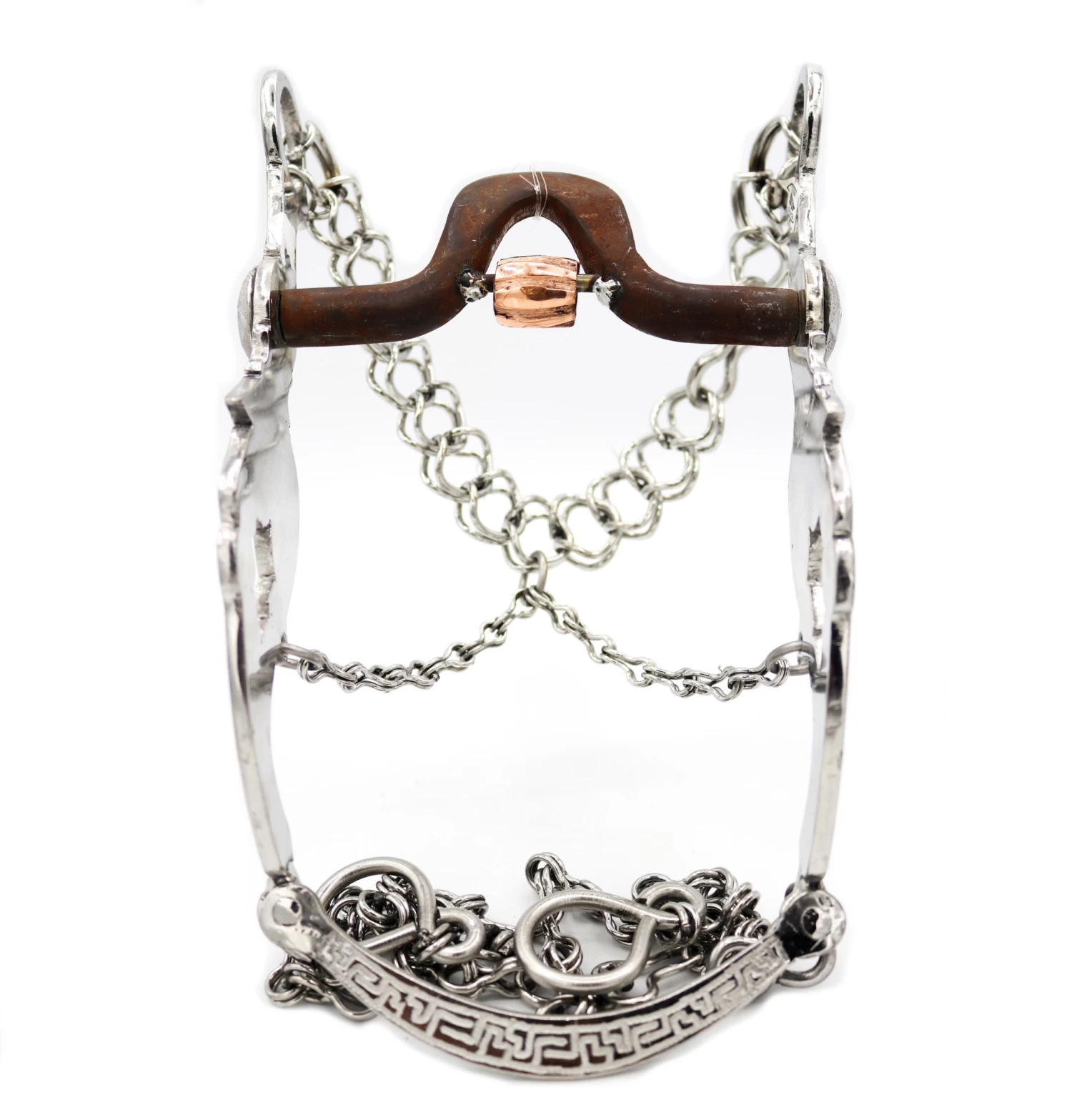 This authentic custom design stainless steel charro horse bit with copper mouth. Includes a complete set of cadenilla chains.