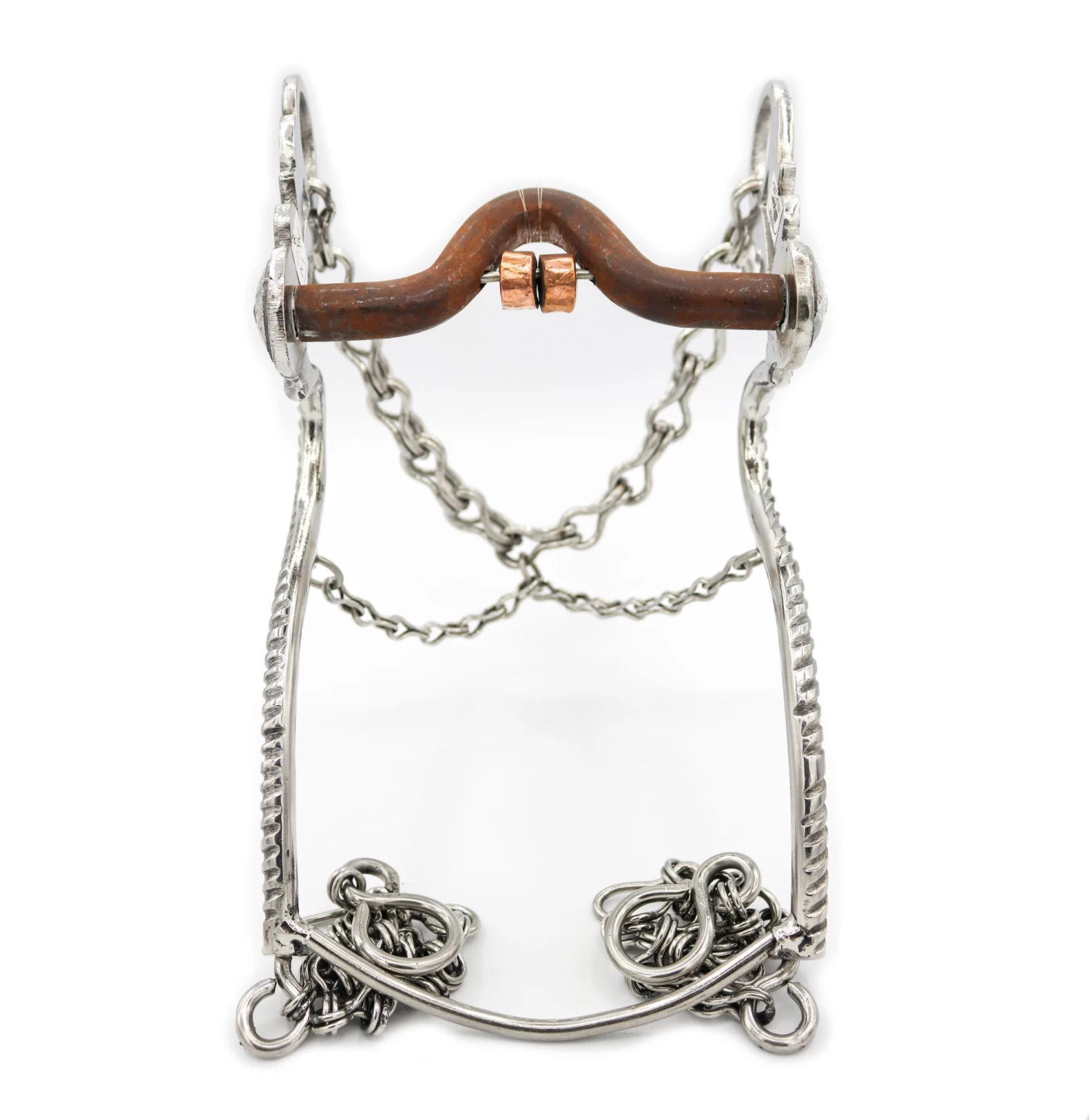 This authentic stainless steel charro horse bit with rolling copper. Includes a complete set of cadenilla chains. Este es un autentico freno charro con acero inoxidable con cobre. Incluye un conjunto completo de las cadenas. Details: 5 1/4″ Width(ancho) 9″ Length(largo)