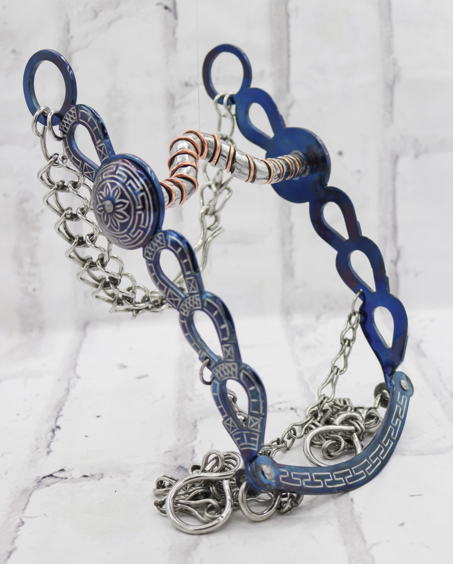 Blue low/medium port stainless steel mouthpiece with full copper mouth , burnished black finish and simple engraving featuring 5 1/4″ mouth. With a complete set of cadenillas chains.