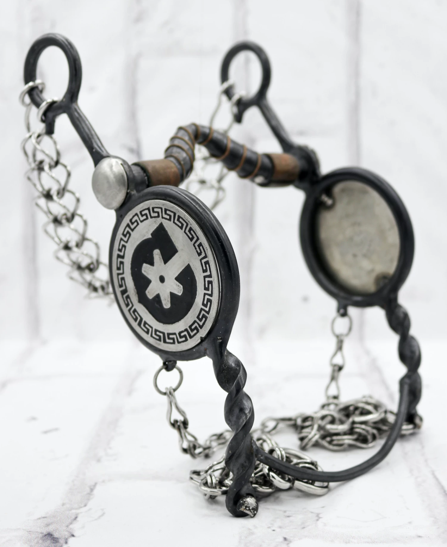 This authentic custom design black stainless steel charro horse bit with copper mouth. Includes a complete set of cadenilla chains.