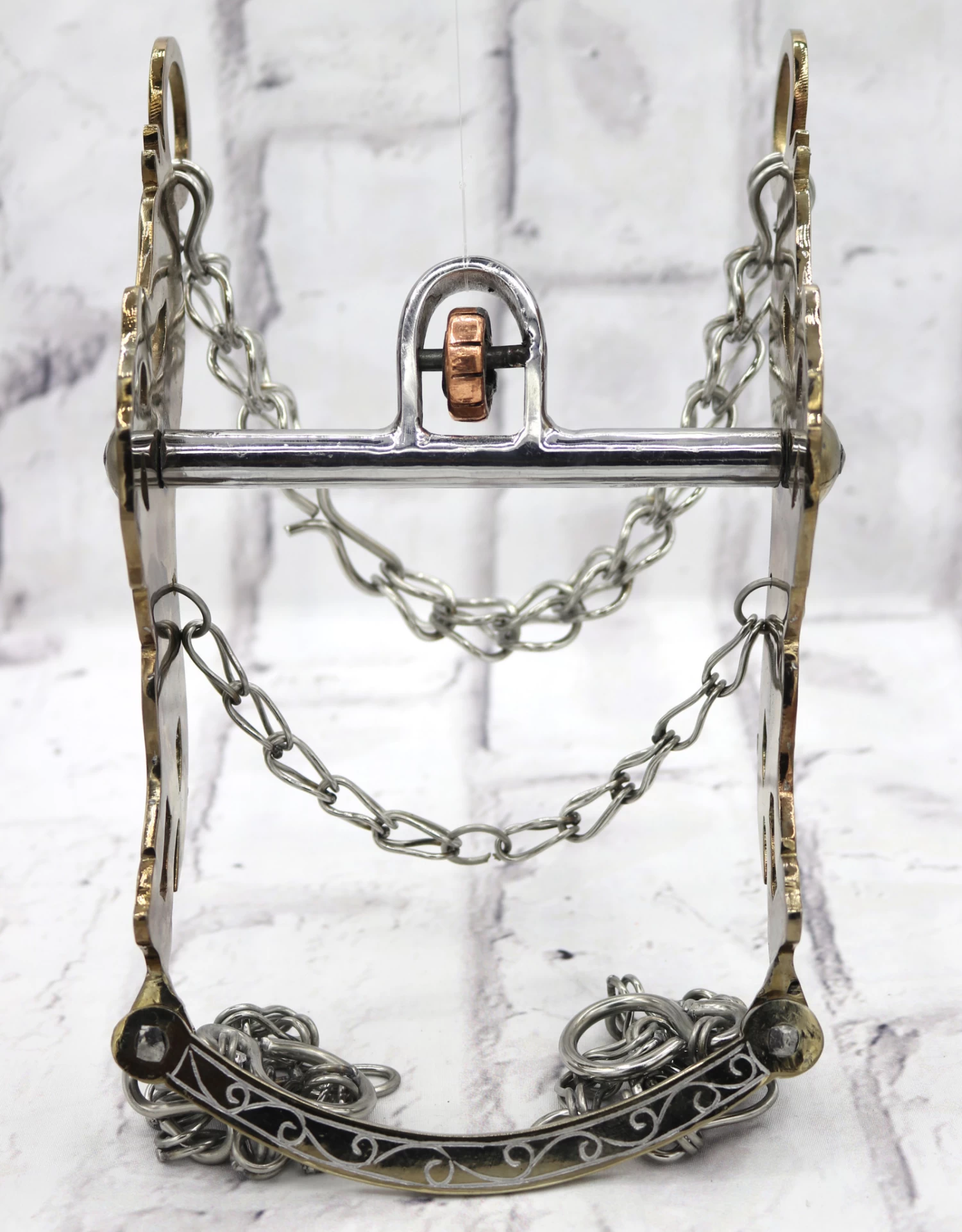 This authentic custom design stainless steel charro horse bit. Brass color horse design. Includes a complete set of cadenilla chains.