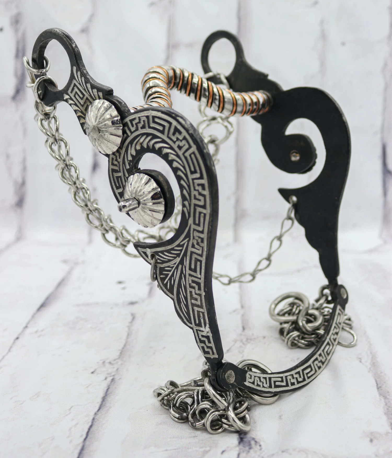 Black low/medium port stainless steel mouthpiece with full copper mouth , burnished black finish and simple engraving featuring 5 3/8″ mouth. With a complete set of cadenillas chains. Freno de porte bajo para caballo bocado de sabor de cobre, acabado color negro pavonado con acero inoxidable  y de grabado sencillo. Width(bocado) – 5 3/8″