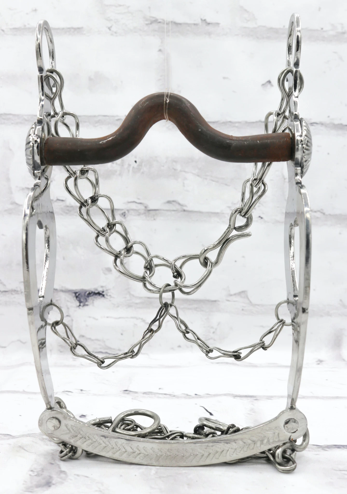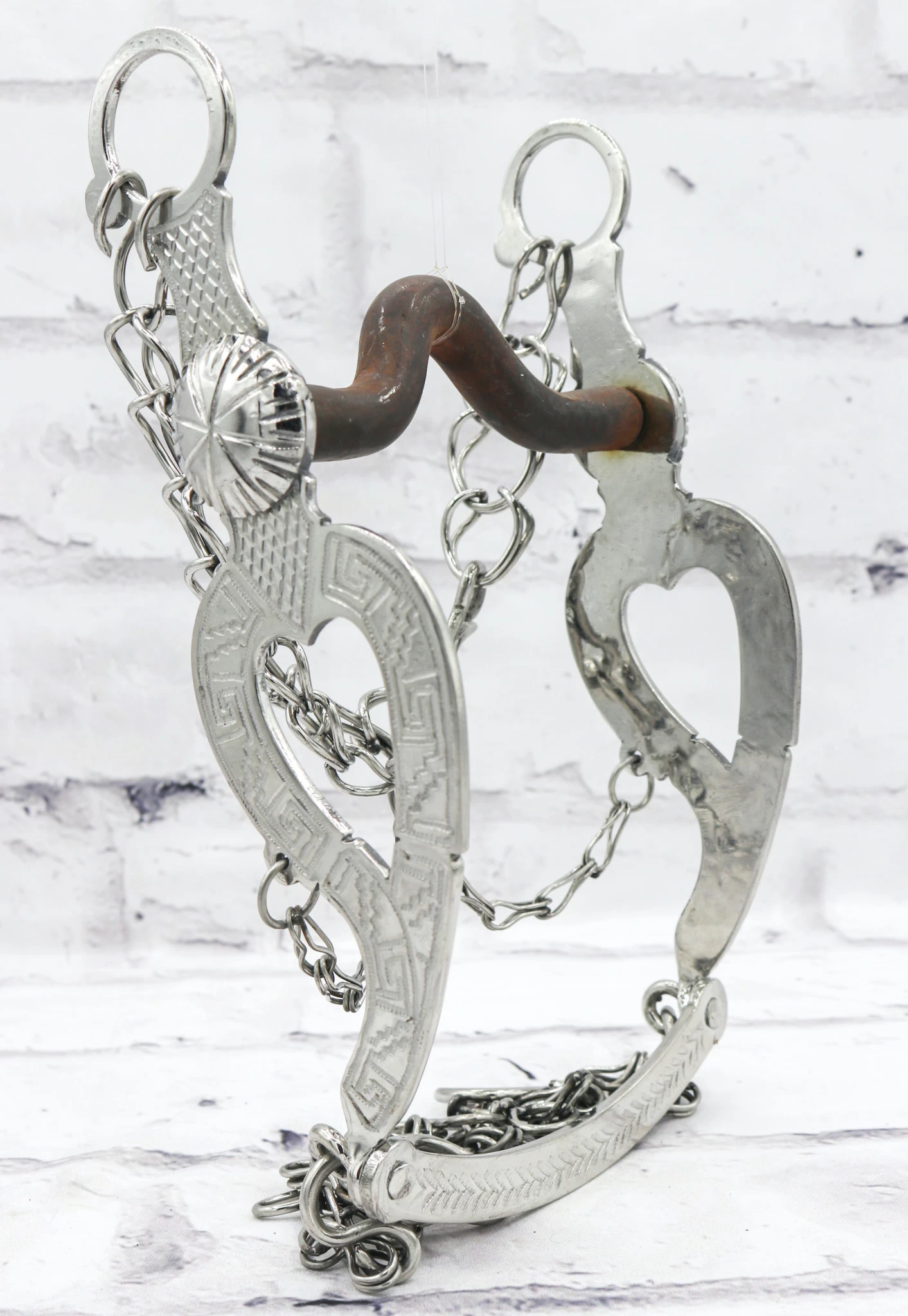 This authentic custom design stainless steel charro horse bit with copper mouth. Includes a complete set of cadenilla chains.