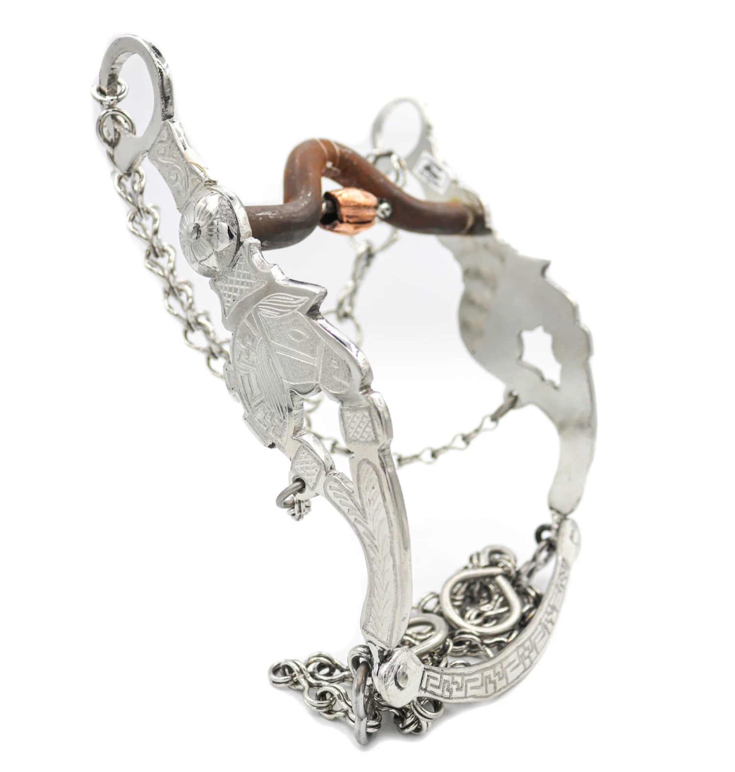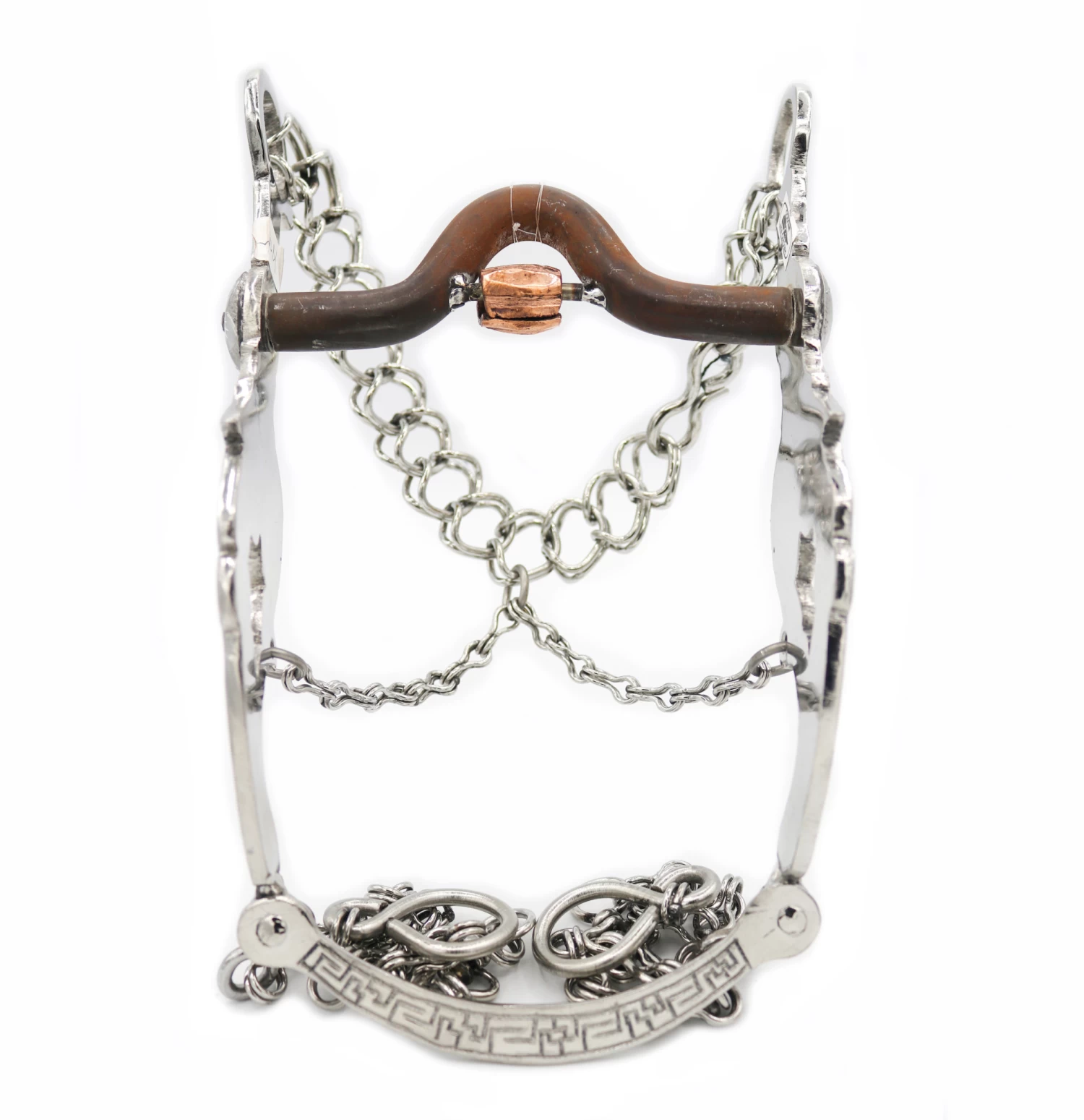 This authentic custom design stainless steel charro horse bit with copper mouth. Includes a complete set of cadenilla chains. Freno (Acero Inoxidable) Charro es de Porte bajo y el juego completo de cadenas. Hecho a mano en Mexico con un diseño autentico charro, 5 3/8″ de ancho y 9″ de largo.