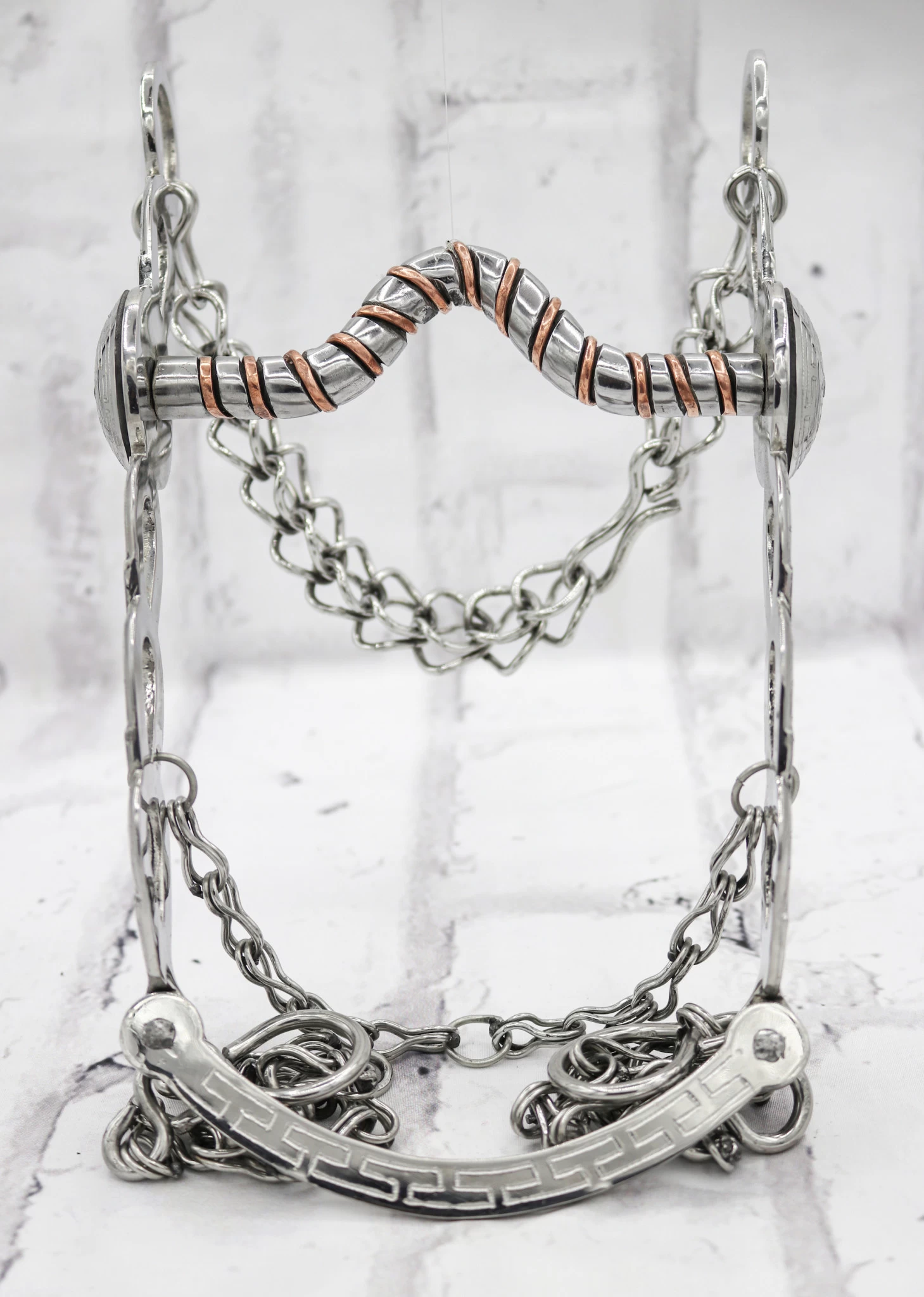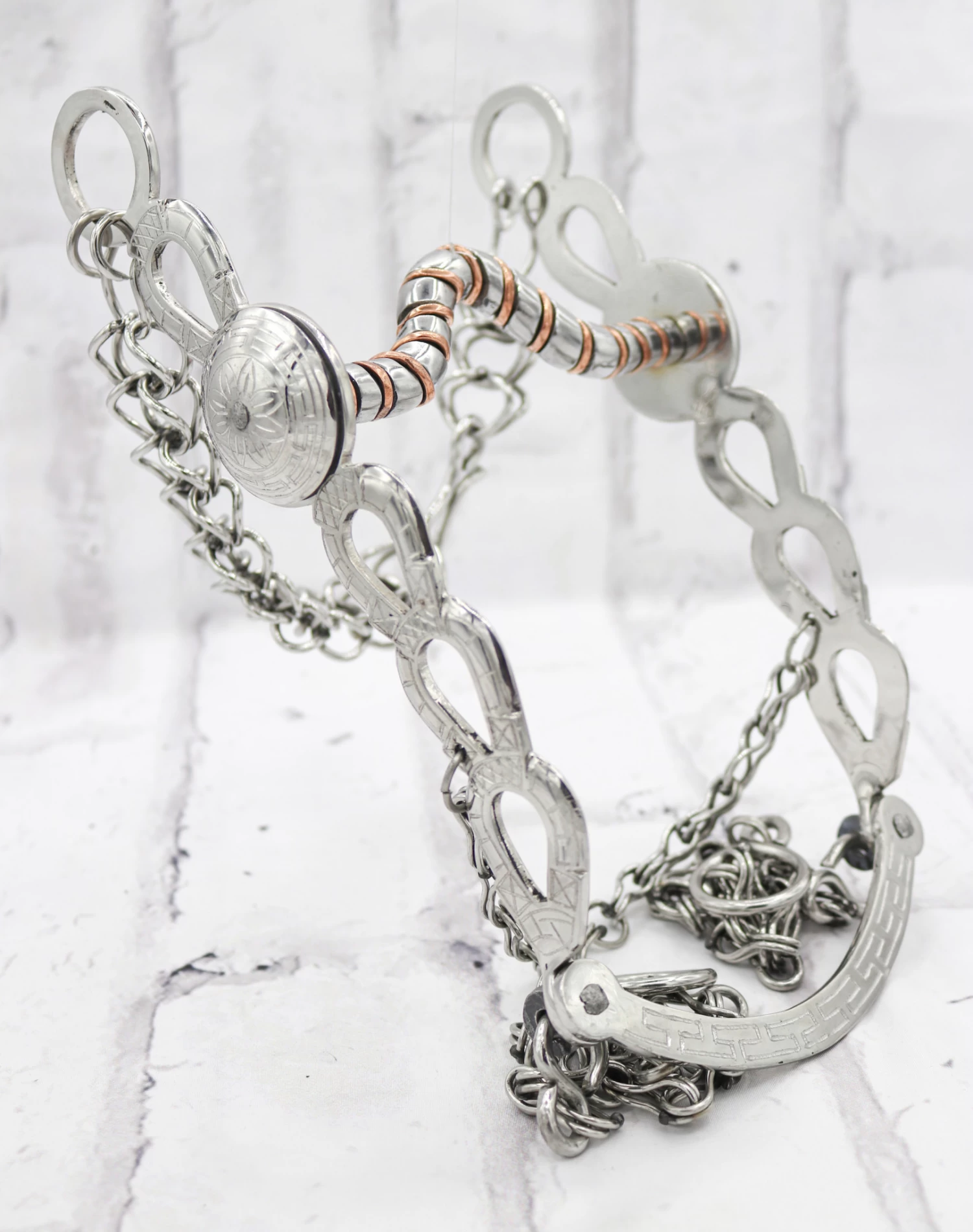 This authentic custom design stainless steel charro horse bit with copper mouth. Includes a complete set of cadenilla chains.
