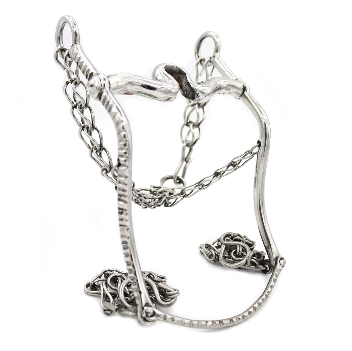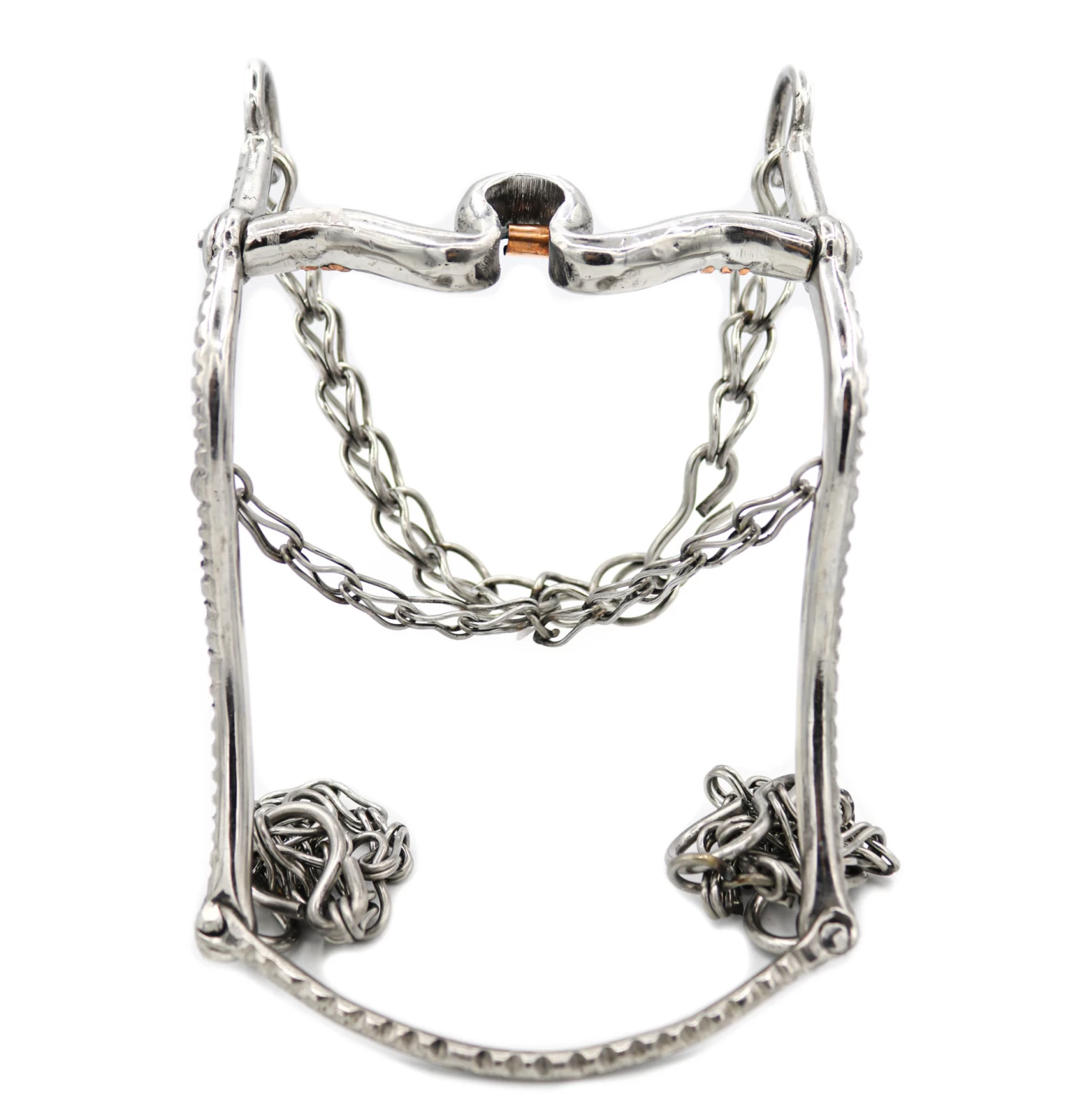 This authentic custom design stainless steel charro horse bit with rolling copper mouth. Includes a complete set of cadenilla chains.