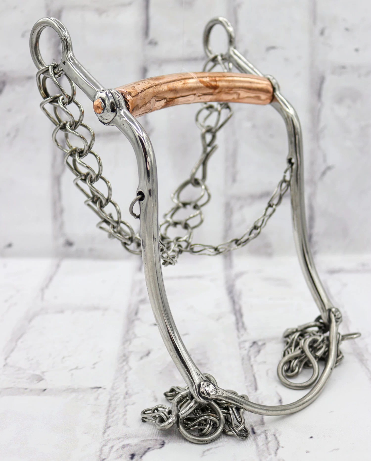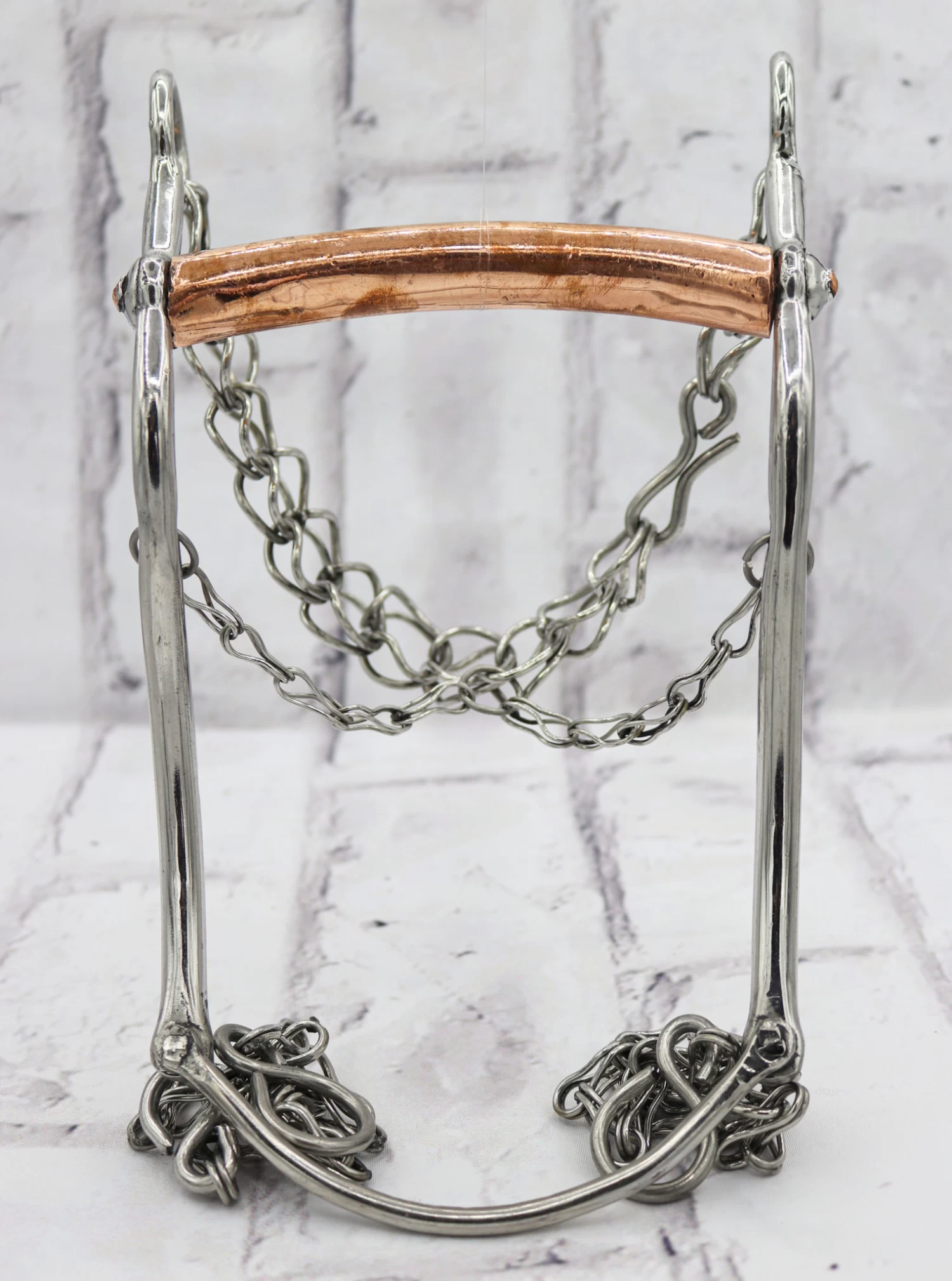 Freno Charro es de Porte bajo y juego completo de cadenas. Hecho a mano en Mexico con un diseño autentico charro,5″ (13 cm) de ancho y 8″ de largo.