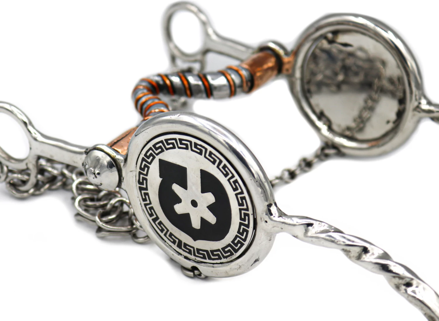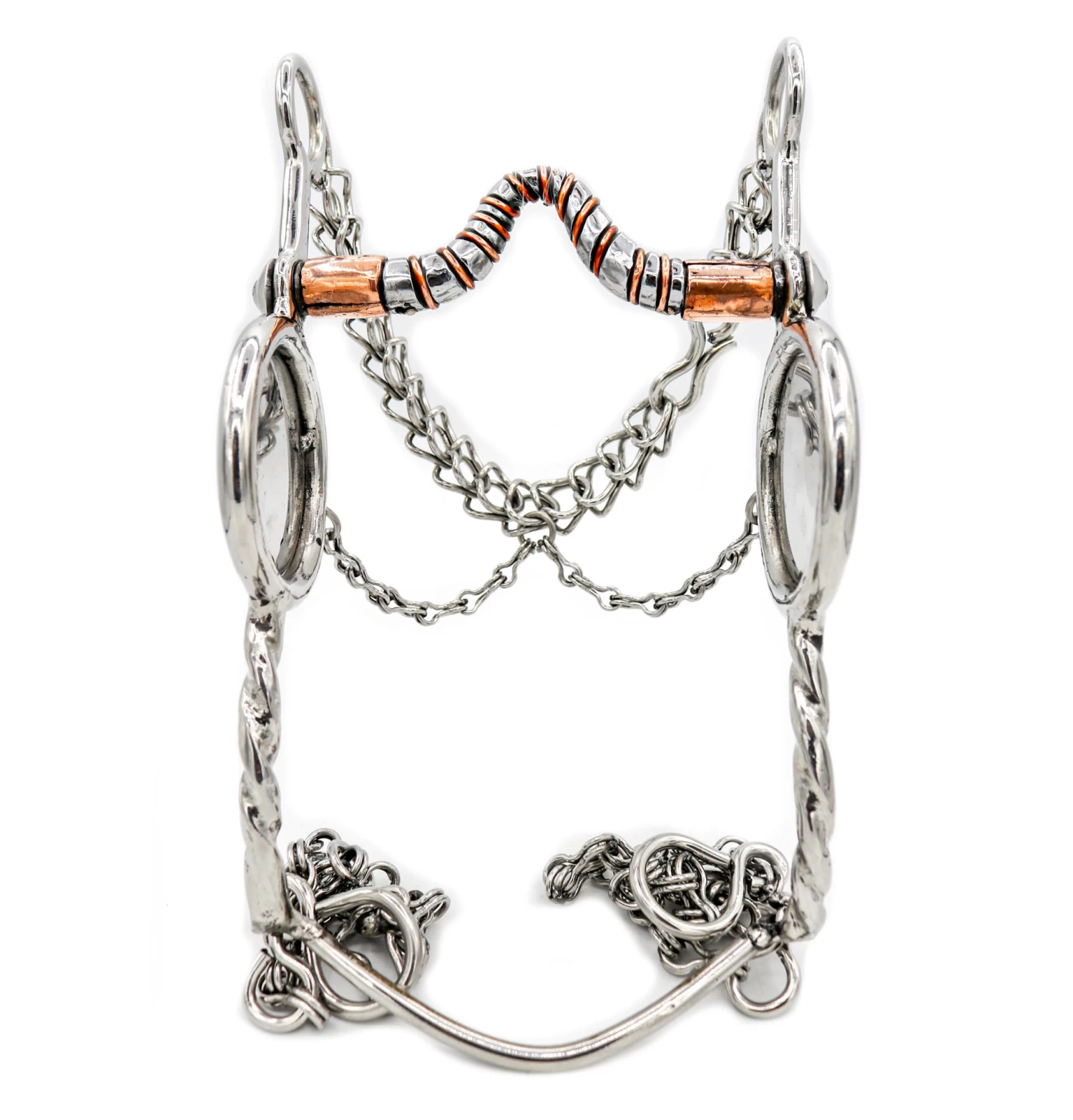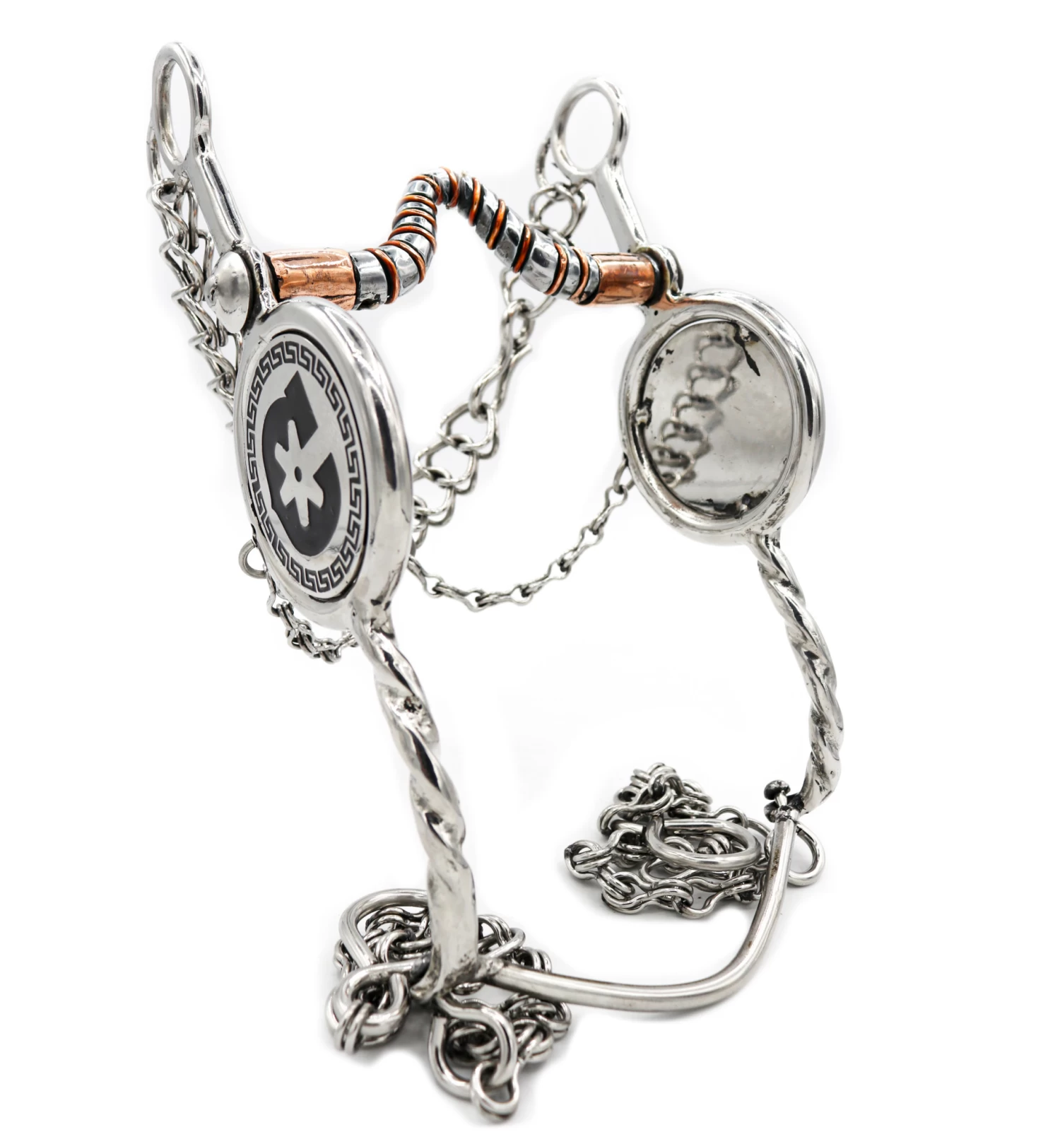 Stainless Steel Bit with Low/Medium port comes with complete charro chain set. Handemade in Mexico with unique Charro design, features copper rollers 5″ mouth and 9″ length.