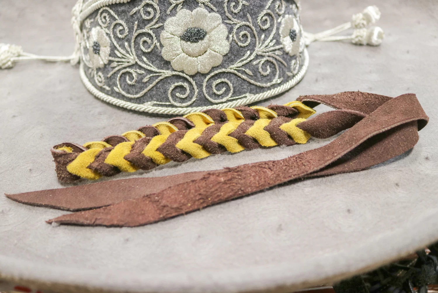 Barbiquejo de gamuza trenzado para sombrero charro que es ajustable. Charro Sombrero Leather hat chin strap braided, it is adjustable.Â