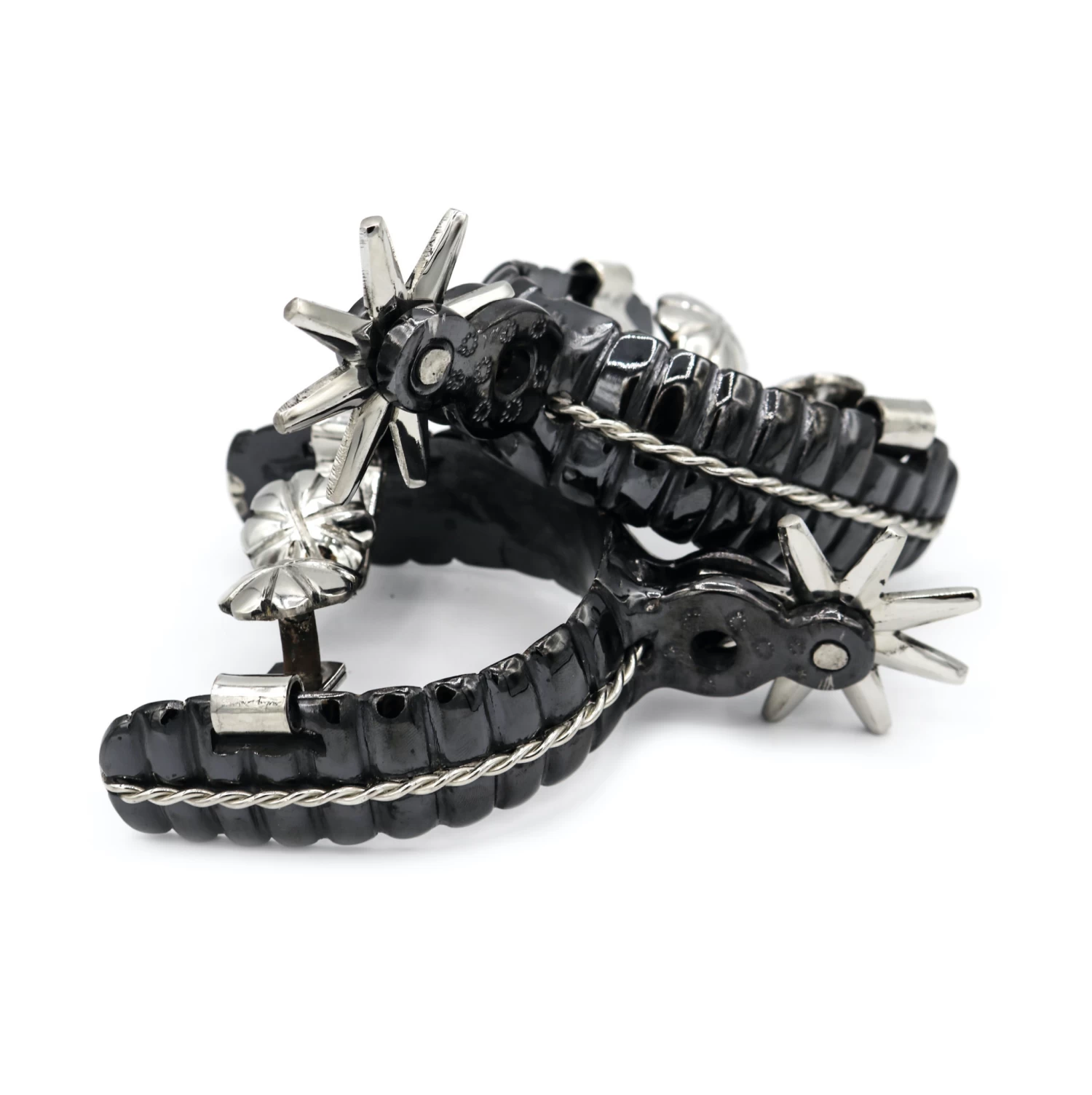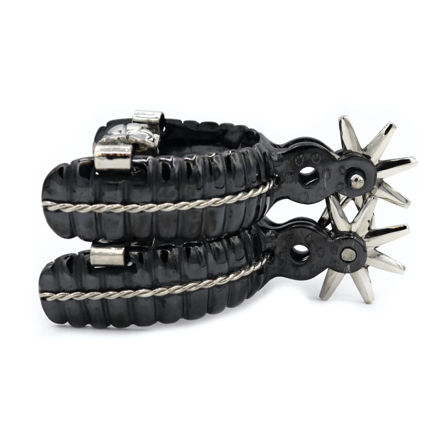 Espuelas negras acero inoxidable con diseño rayado en tono plata por todo el cuerpo. Black Stainless Steel spurs with silver tone inlay stripes all over body.Â
