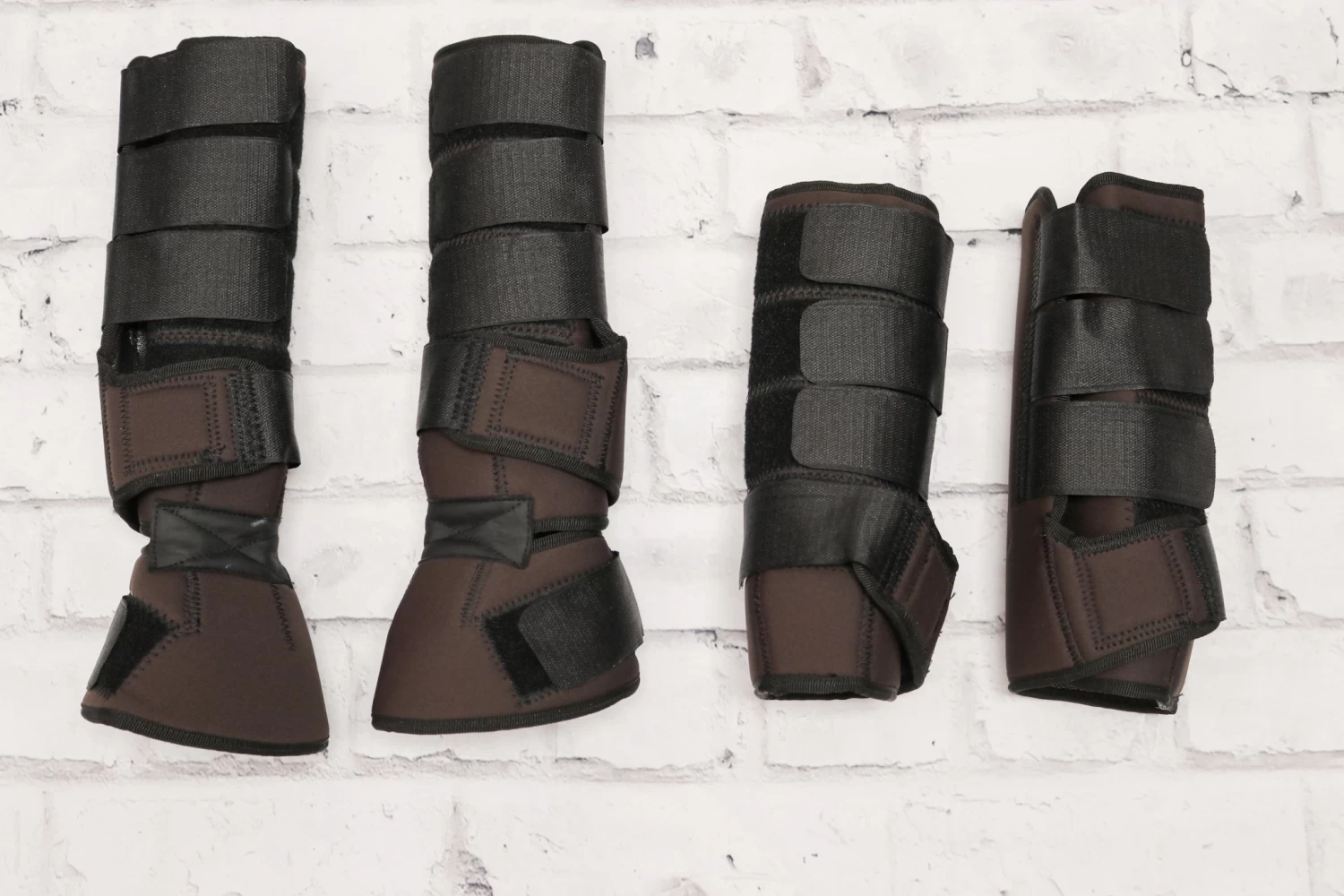 Brown boots composed of Neoprene with velcro offering lower leg and hoof protection. .(4) Front and back horse leg boots. Estas canilleras ofrecen proteccion a la pierna inferior y superior del casco . Este juego de protectores esta compueto de Neoprene y cuenta con cierre de velcro muy resistente. (4) Protectores delanteros y traseros para caballo.Â