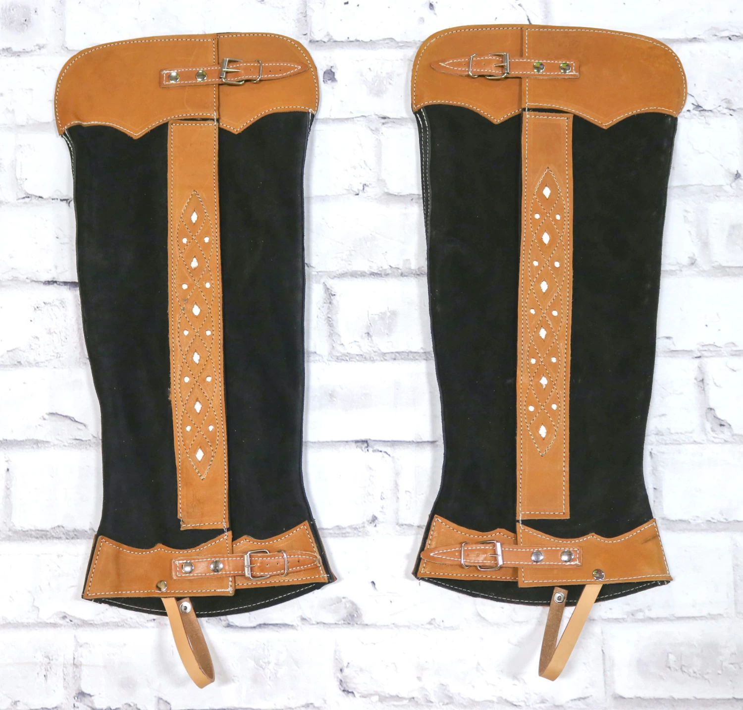Adult sized long rough-out leather leggings with velcro closures down the outside of the leg terminating in a heel strap designed to keep the legging chaps from riding up.Made in Mexico.Custom Design,adjustable.