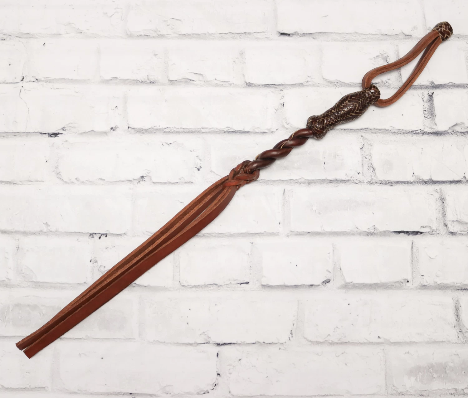 Braided leather contoured handle with leather wrist strap and four- strand lash.