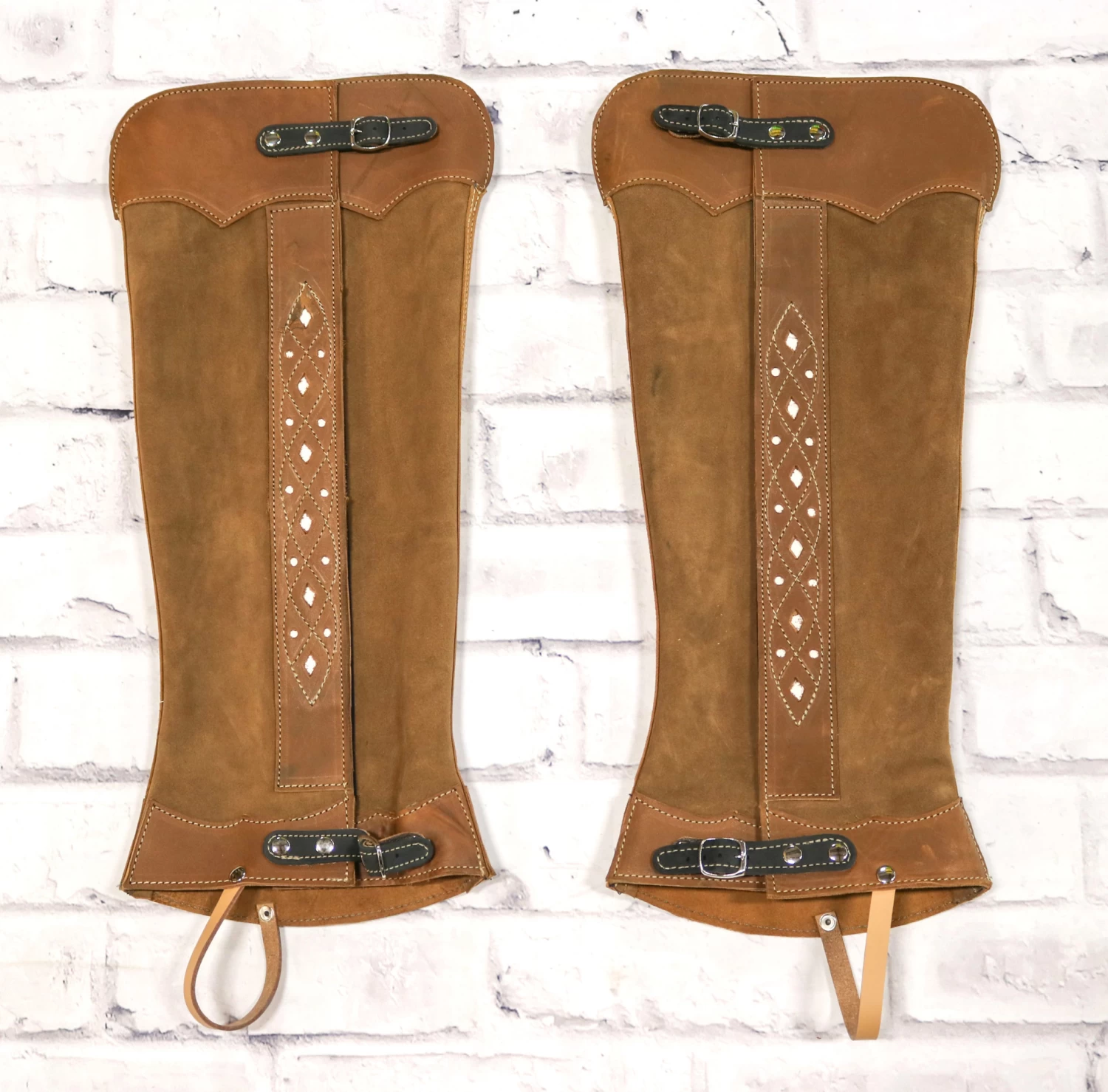 Adult sized long rough-out leather leggings with velcro closures down the outside of the leg terminating in a heel strap designed to keep the legging chaps from riding up.Made in Mexico.Custom Design,adjustable.