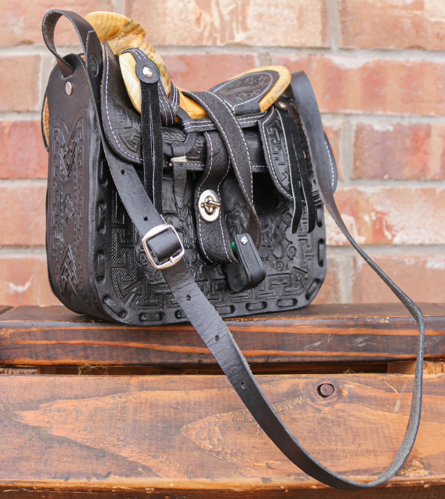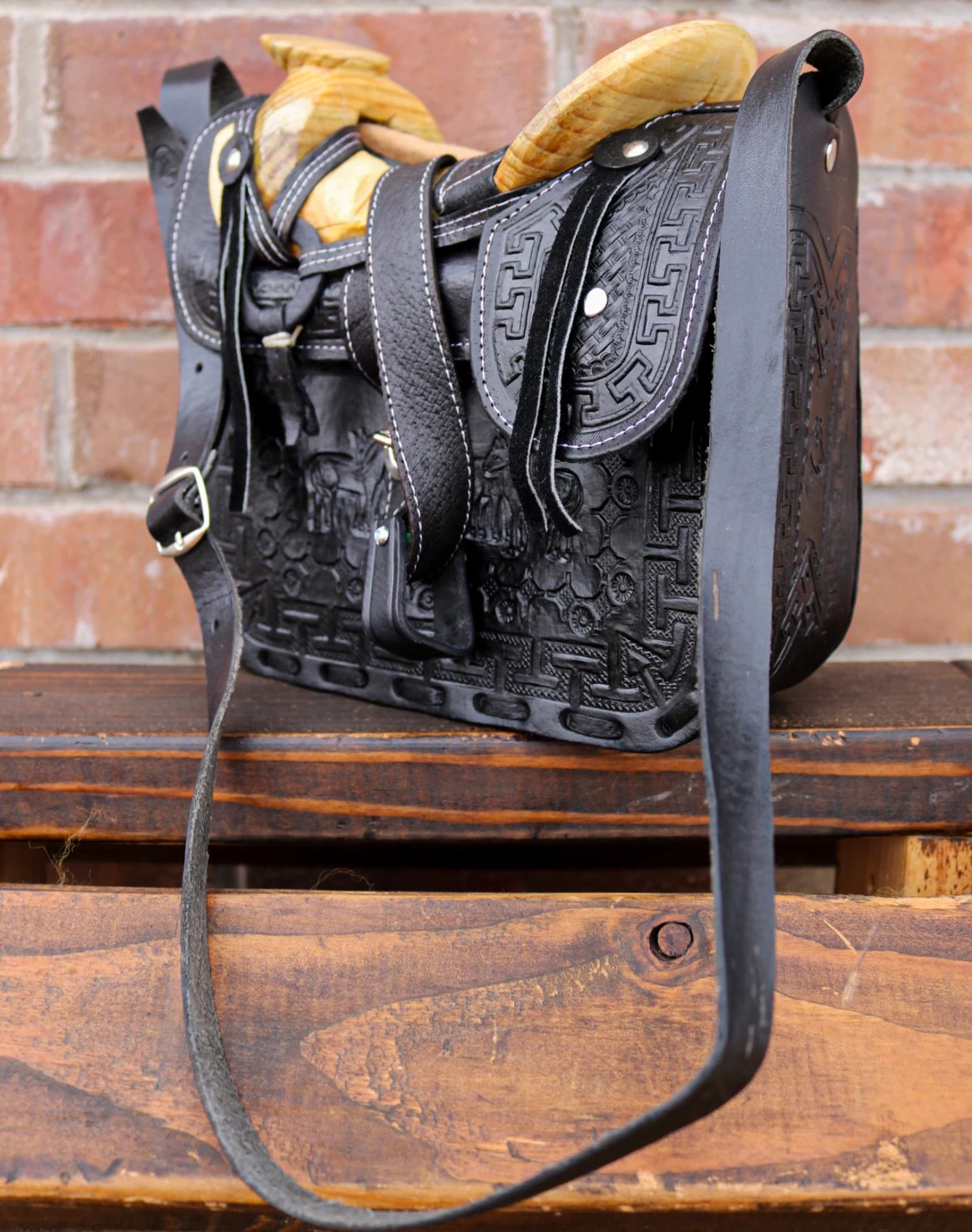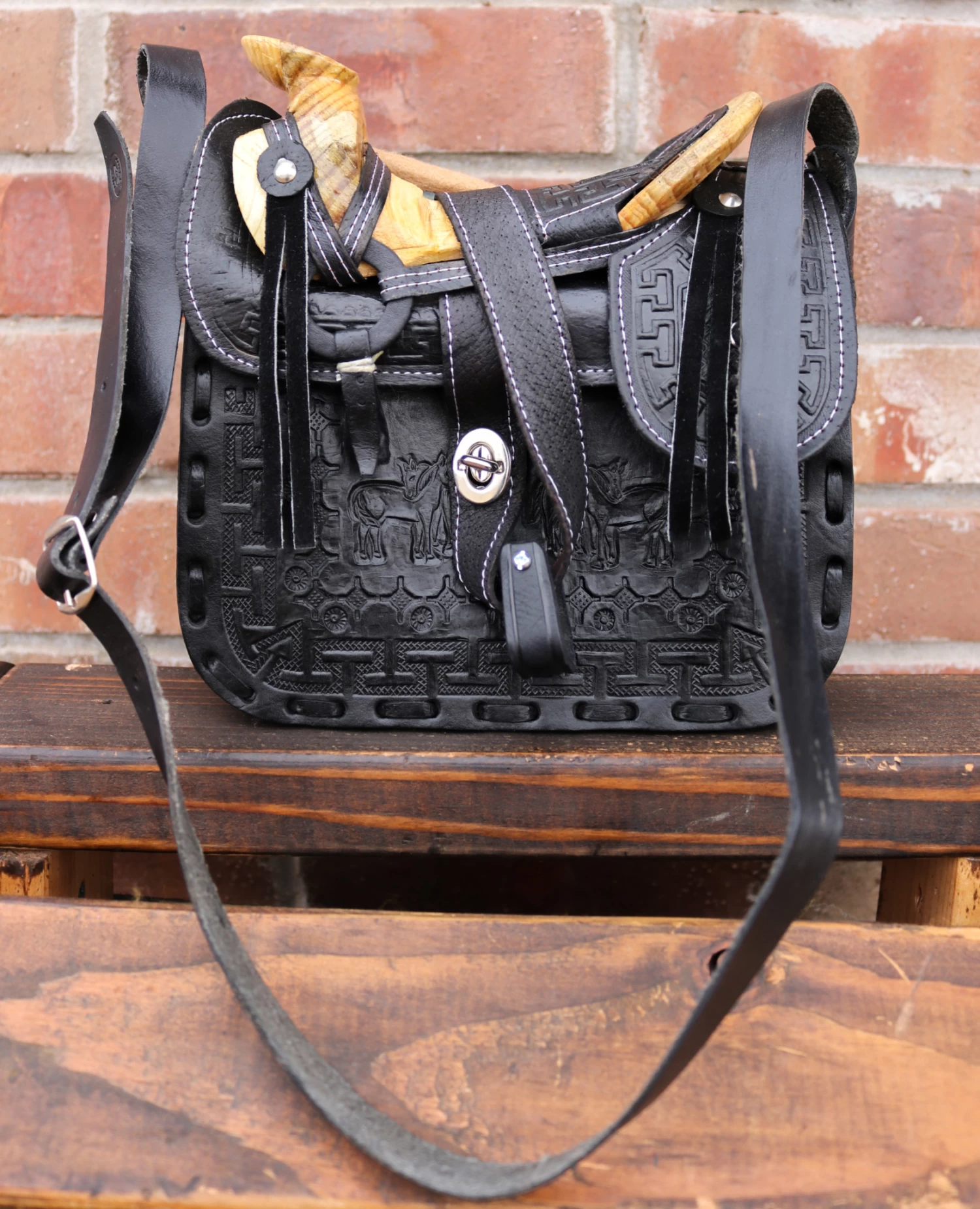 All handmade charro saddle purse made with real leather and has tooling, suede leather that has black stitching. Bolso hecho a mano con piel de calidad. Hecha con fuste charro, en color negro.