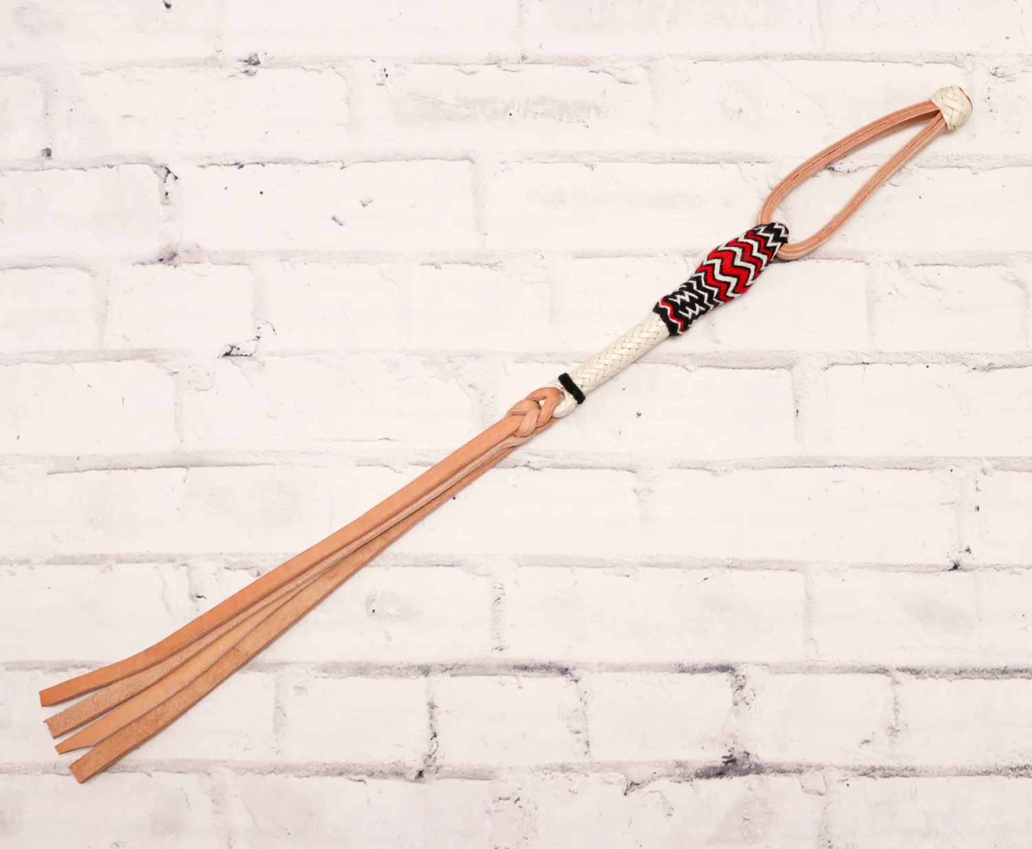 Braided leather contoured handle with leather wrist strap and four- strand lash.