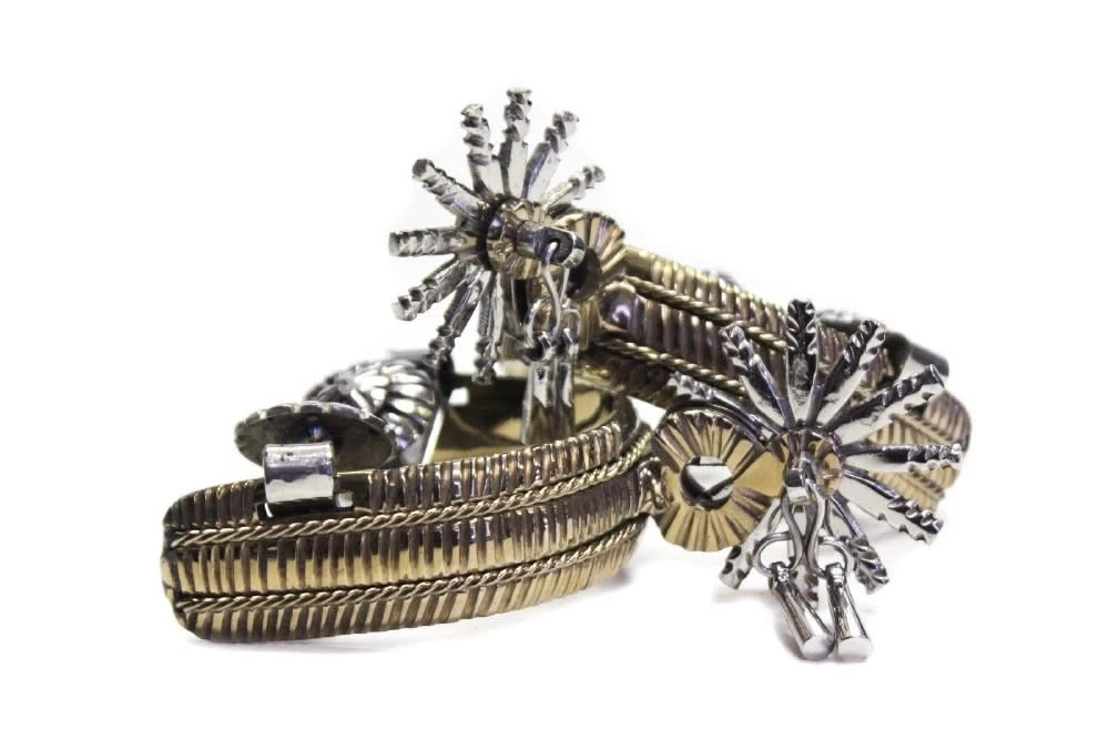 Charro spurs unique handmade with unique designover the entire body with rowel. Adult sized. Espuelas Charras diseño único por todo el cuerpo con rondana. Adultos de tamaño. Details: Boot Opening- 3 1/4″ Rowel(Rondana) – 2 1/8″ Width(Ancho)- 1″