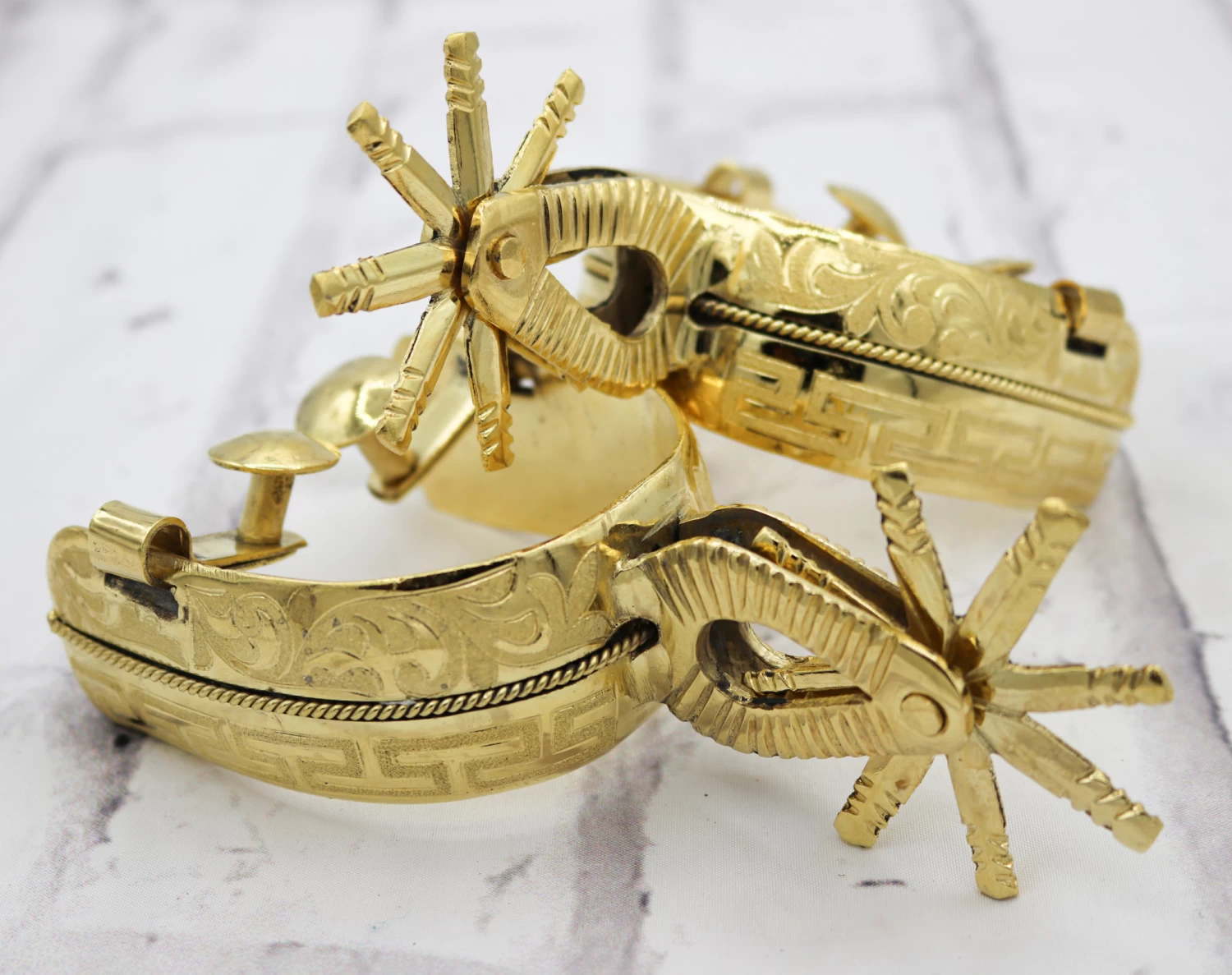 Handmade charro spurs features unique floral design. Gold Plated. Adult sized.