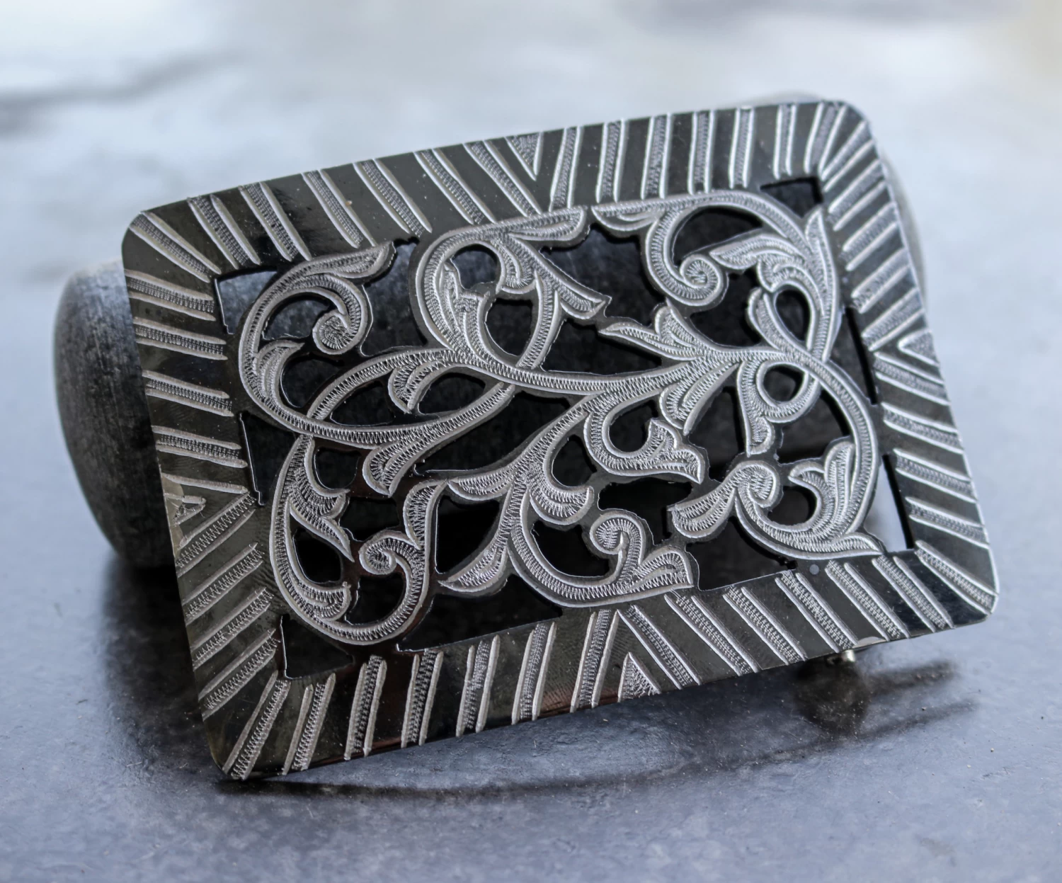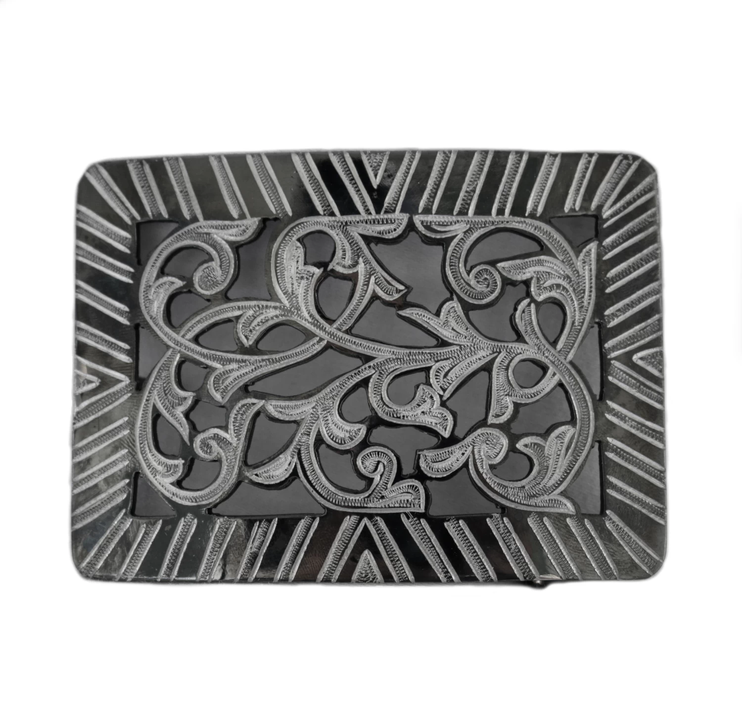 Beautiful Handmade belt buckle made from black stainless steel with traditional design and unique charro border detail. Buckle fits belts up to 2 1/8″ wide.