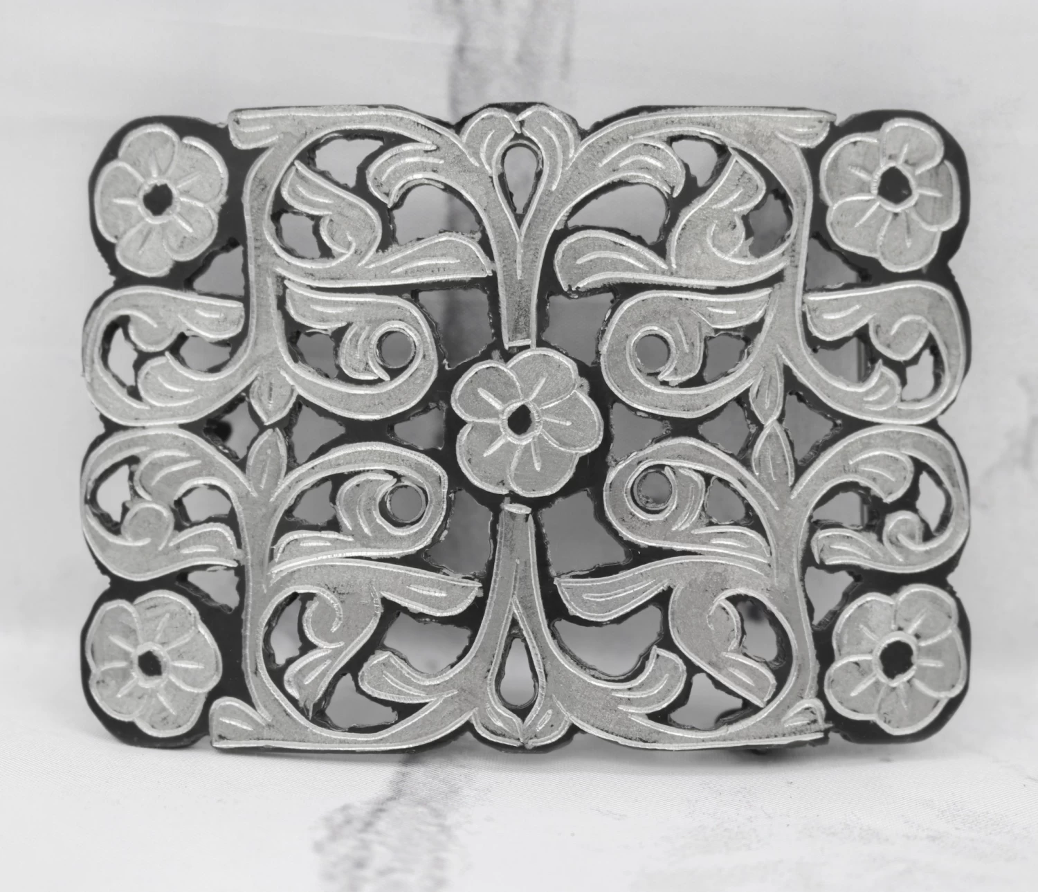 Beautiful Handmade belt buckle made from black stainless steel with traditional design and unique charro border detail. Buckle fits belts up to 2 1/8″ wide.