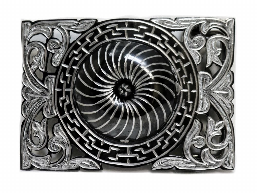 Beautiful Handmade belt buckle made from black stainless steel with traditional design and unique charro border detail. Buckle fits belts up to 2 1/8″ wide.