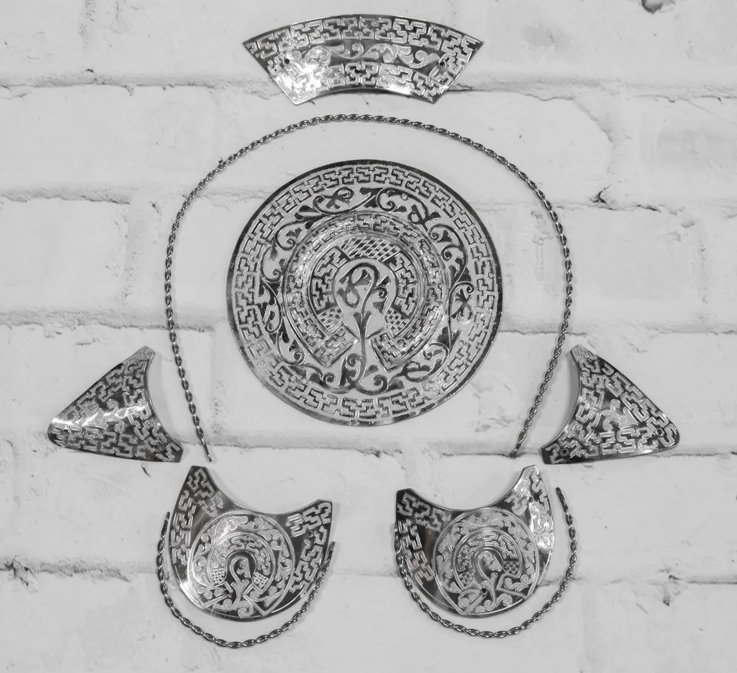 Herraje de acero inoxidable para montura charra de (9) piezas grabadas a mano que incluyen: 1 Disco para la cabeza de la montura 2 Medias Lunas 2 Triangulos 2 Placas para Hombros 1 Placa Teja