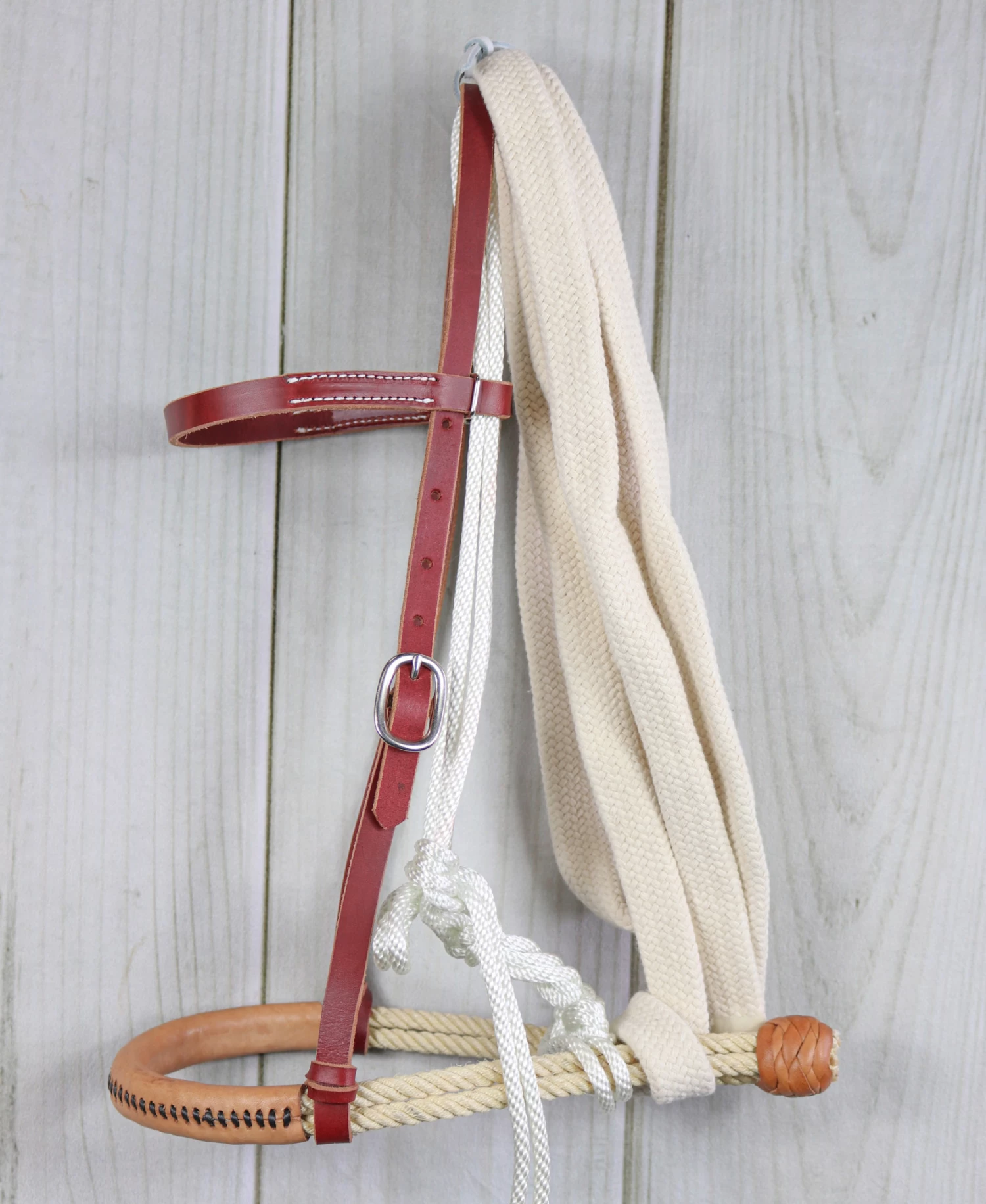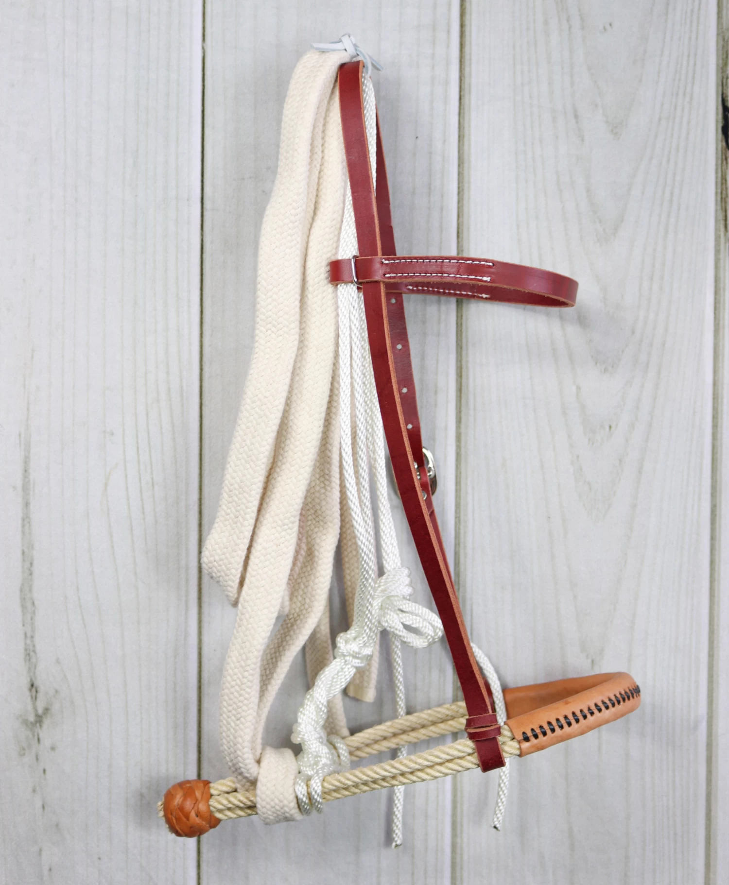 A horse breaking hackamore set that will stand up to hard use. Mecate Ixtle Rope Bosal with contrasting leather laced overlay. Leather browband headstall and soft cotton braided reins. Mecate Rope Bosal. Horse Size.