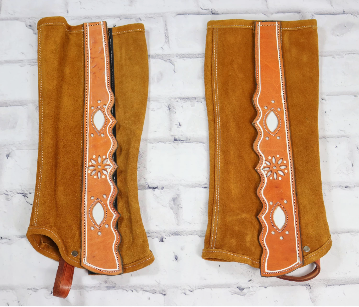 Soft Leather leggings featuring Velcro closures with beautiful custom design. Very comfortable and easy to take on and off, adjustable. Made in Mexico.